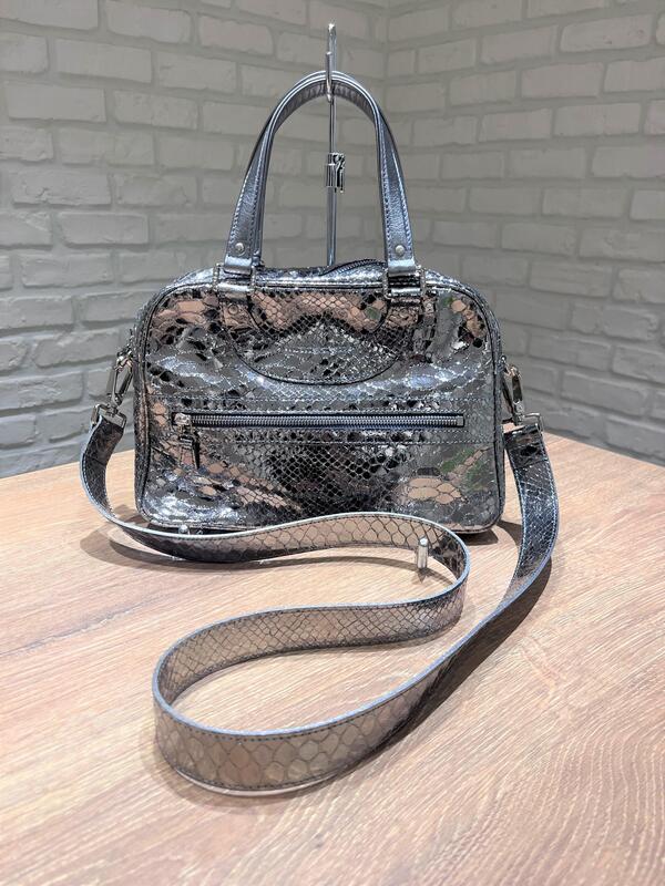 本日ご紹介するのはシルバーカラーのうろこのようなテクスチャのバッグです。