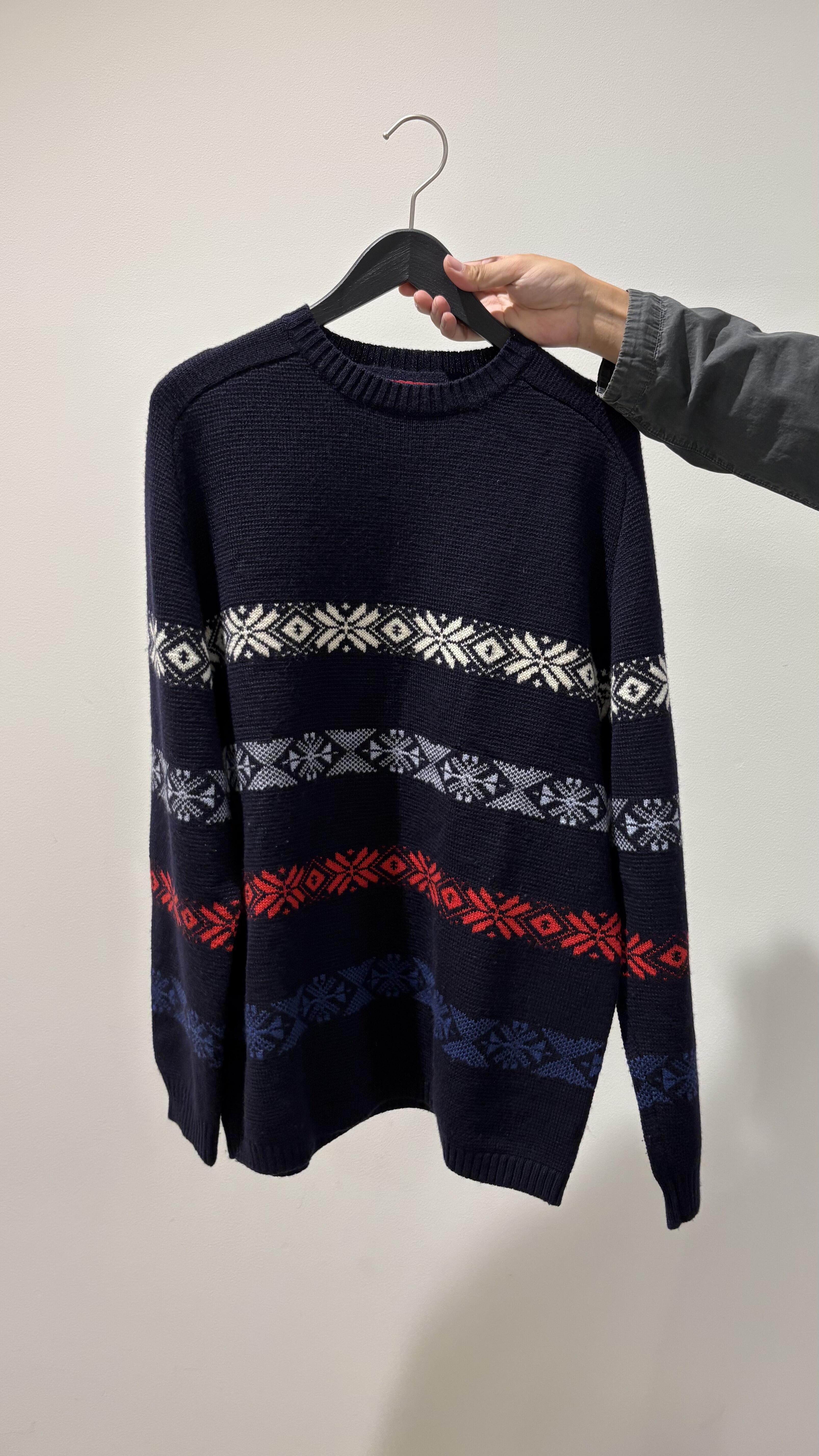 ネイビーをベースに雪の結晶を思わせるノルディック柄が入った一着。赤や白の差し色が効いていて、
