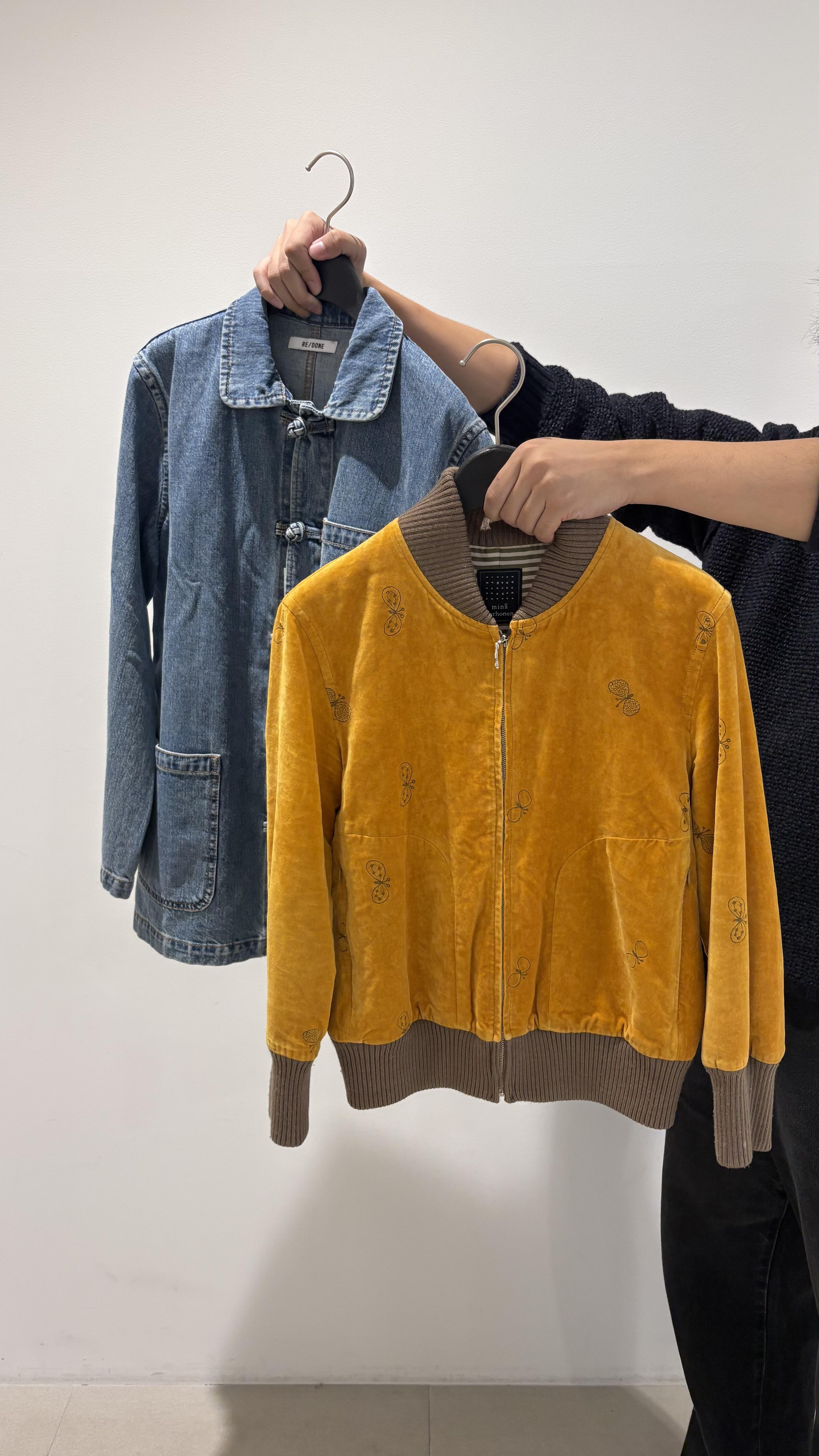 マスタードイエローの柔らかい起毛素材に、繊細な蝶の刺繍がちりばめられています。