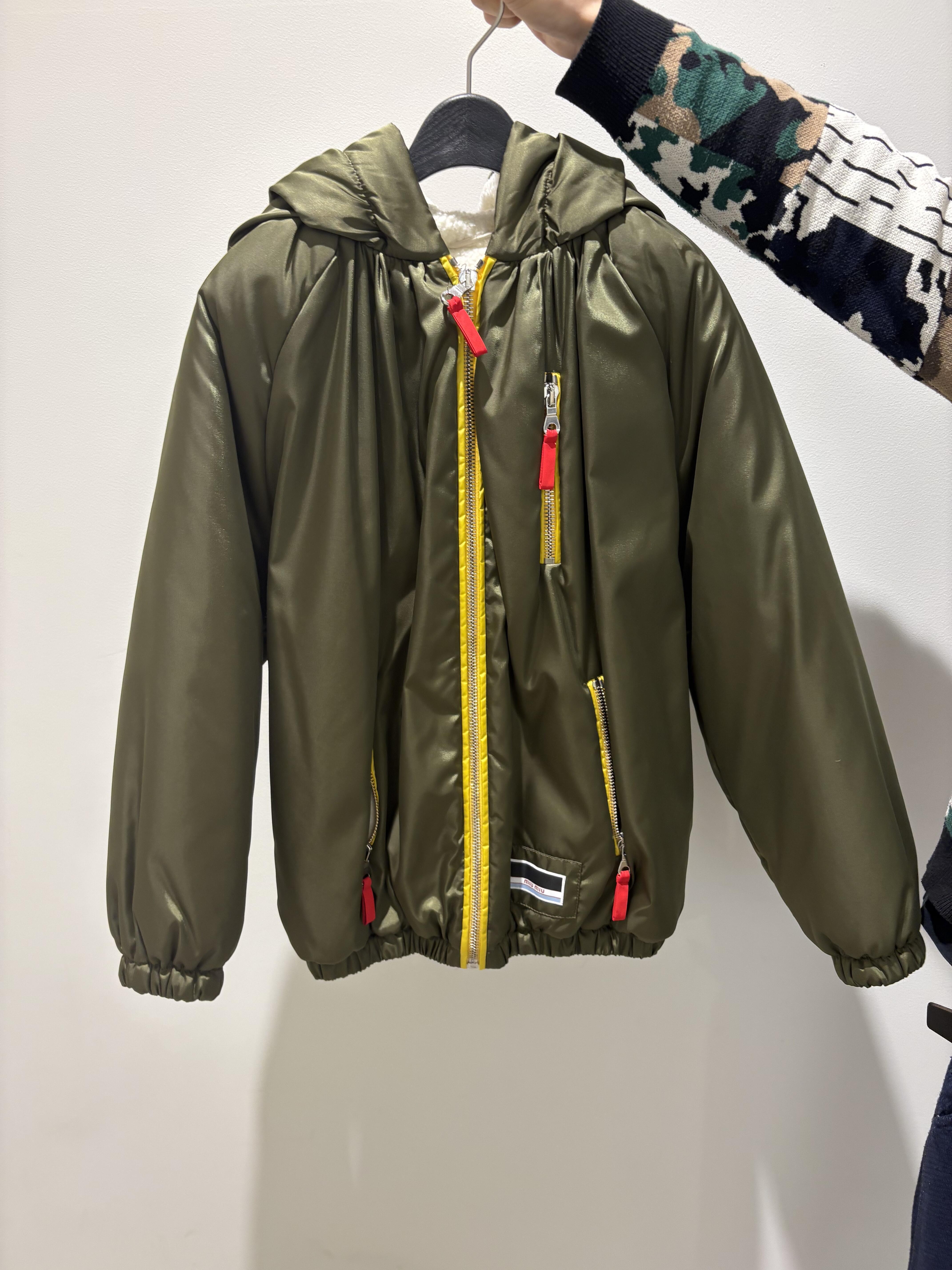 フード周りのギャザーや、全体の丸みのあるフォルムがかわいらしさを残しています。