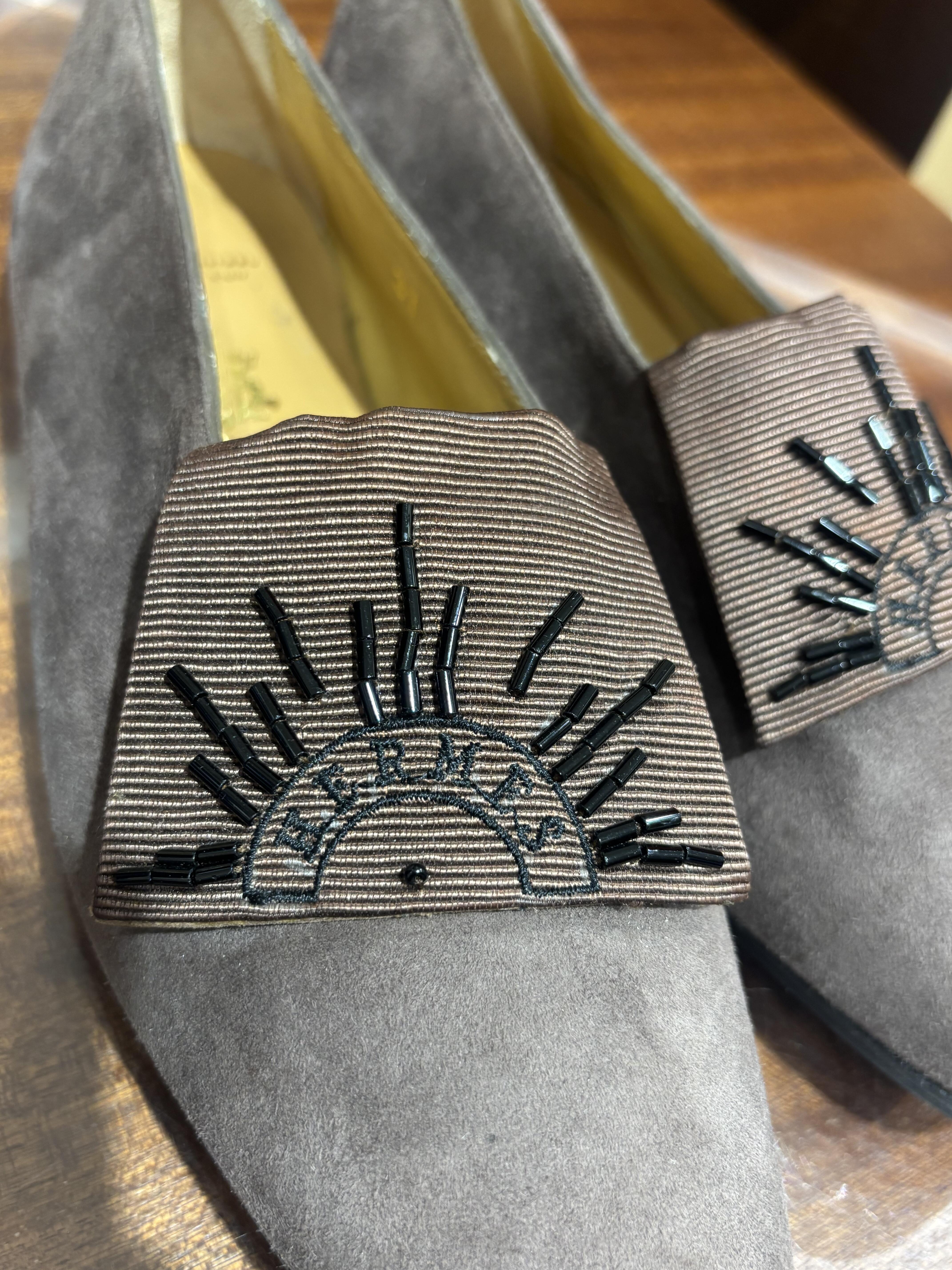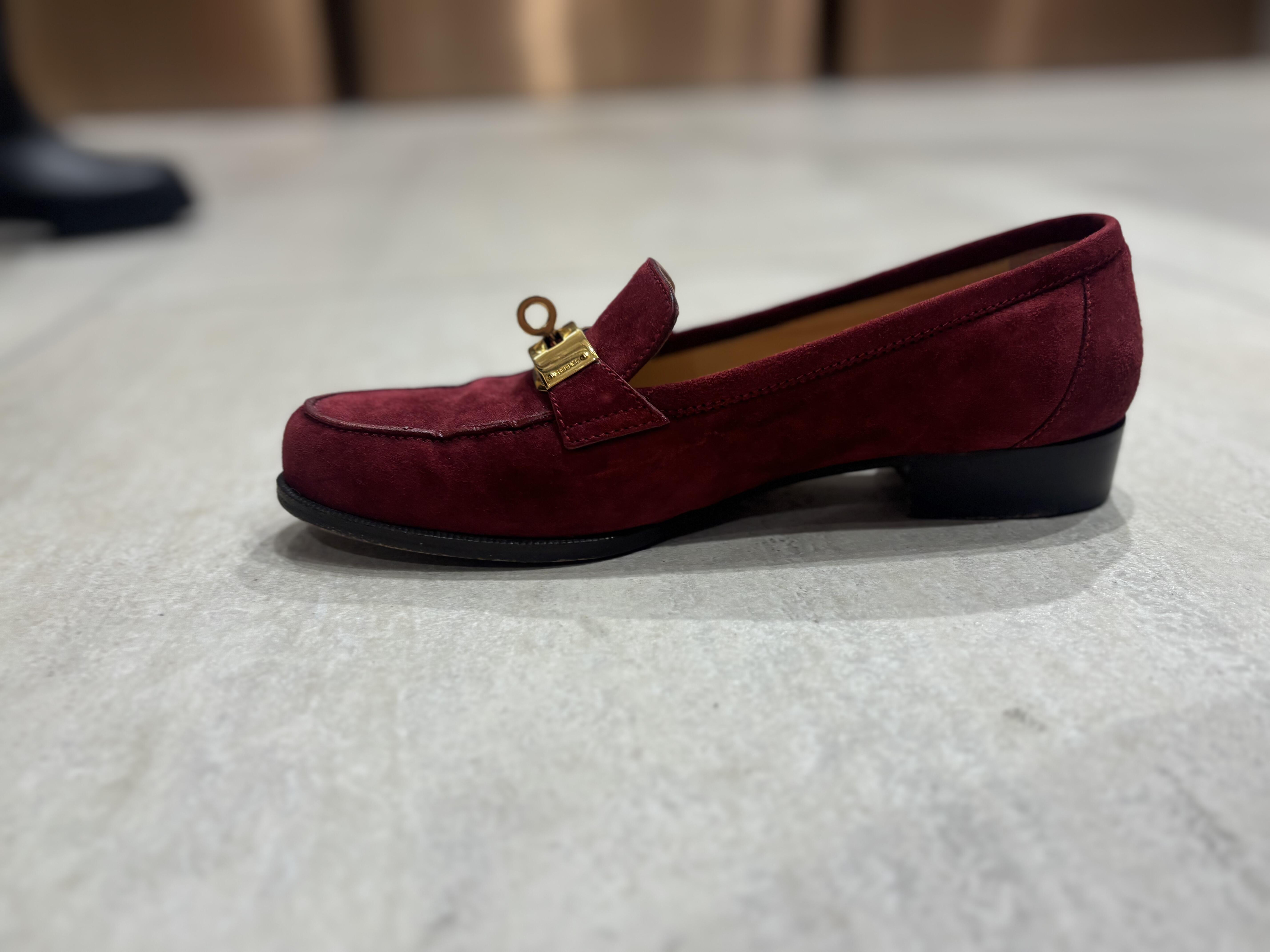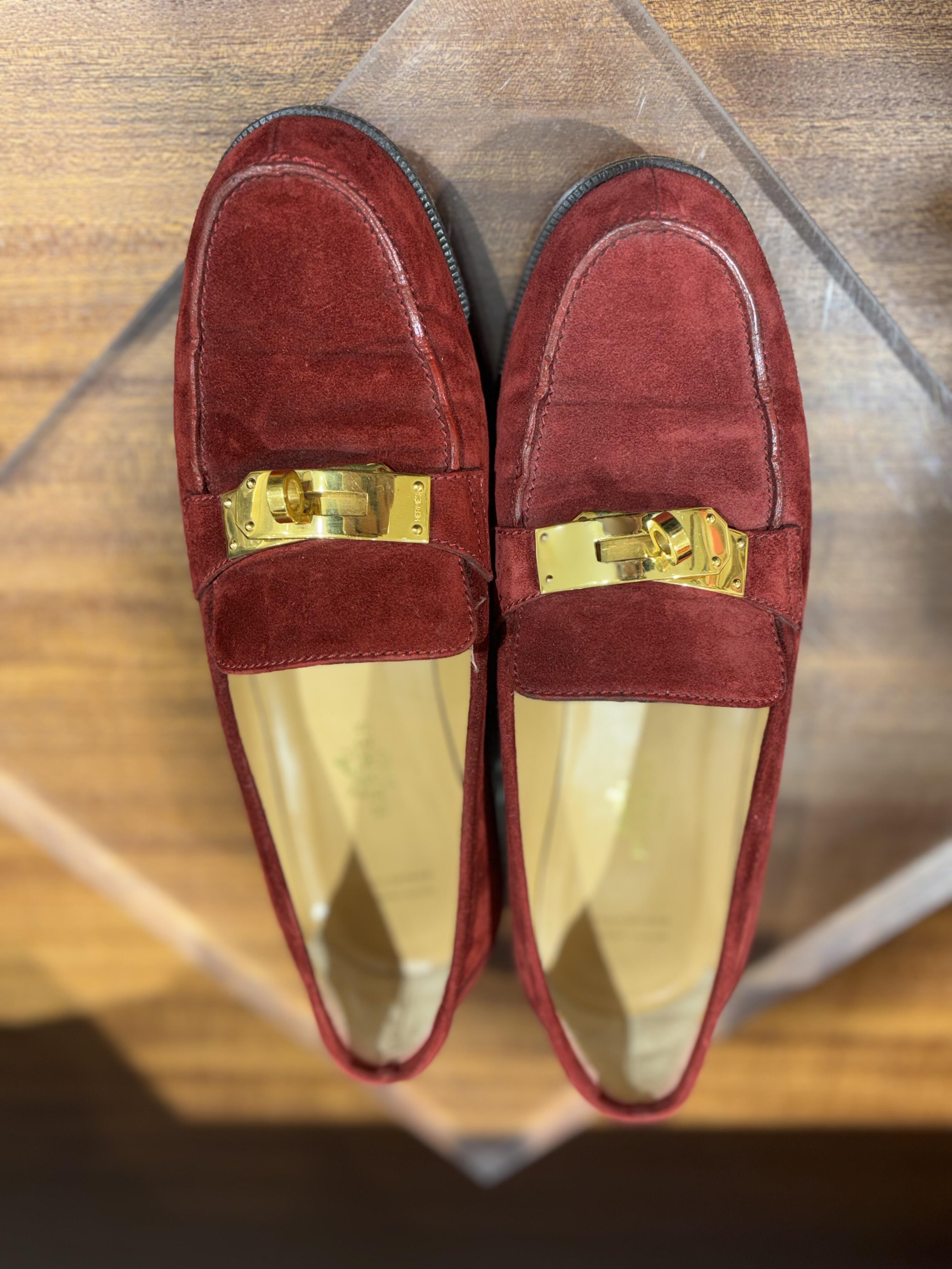 上品な真紅のスエード素材にゴールドの金具なので、これからのホリデーシーズンにもぴったりな一足です。