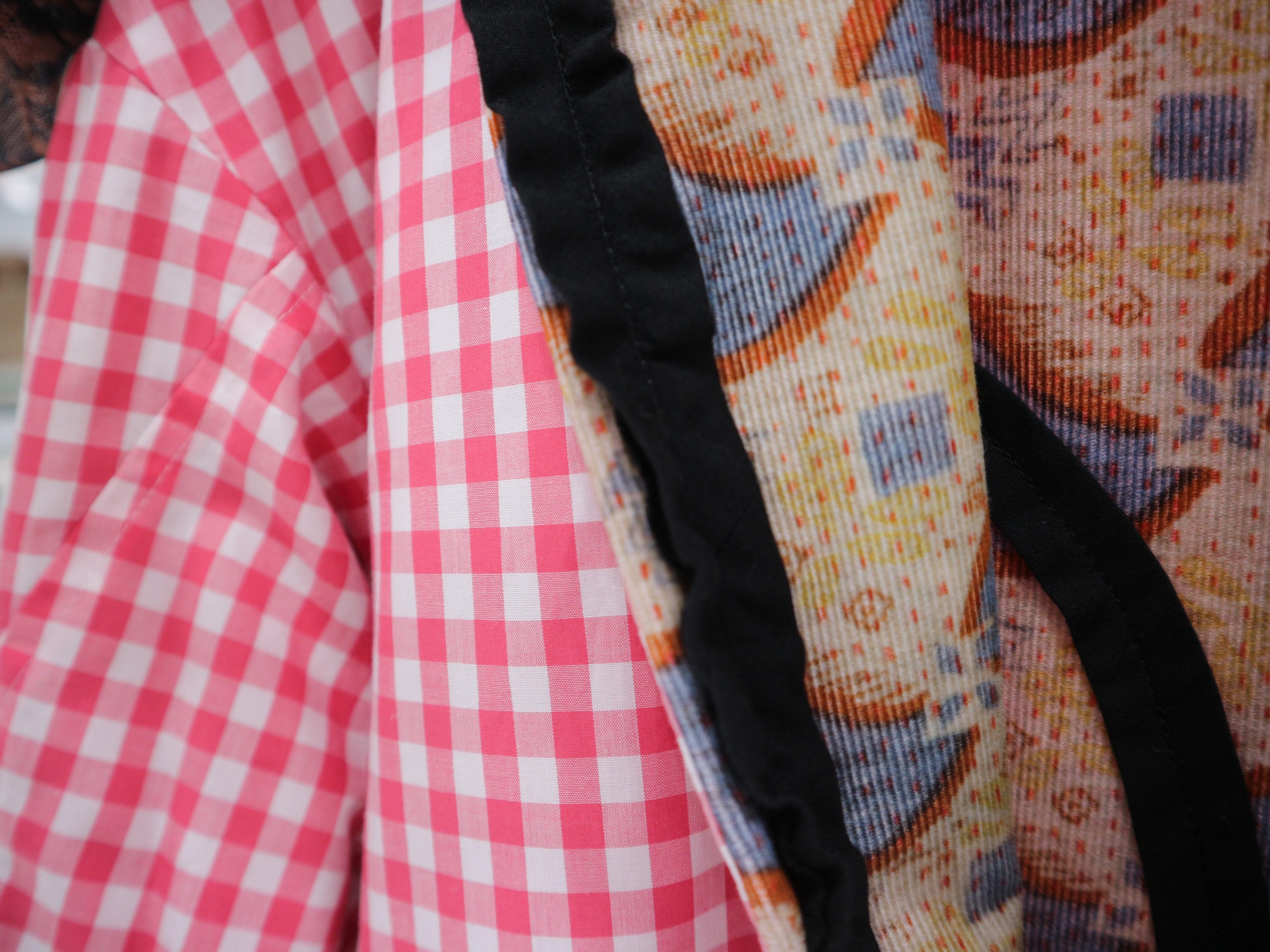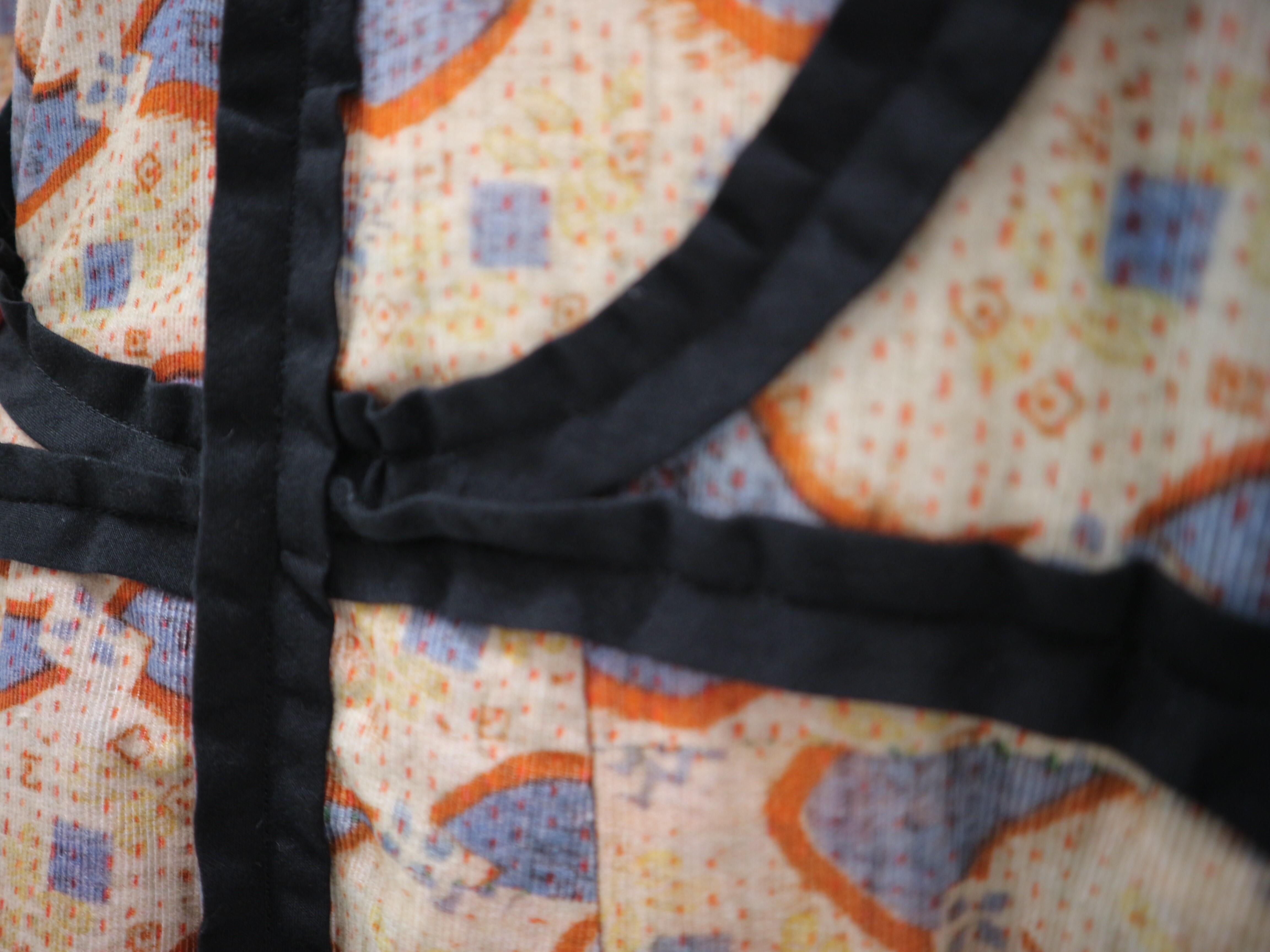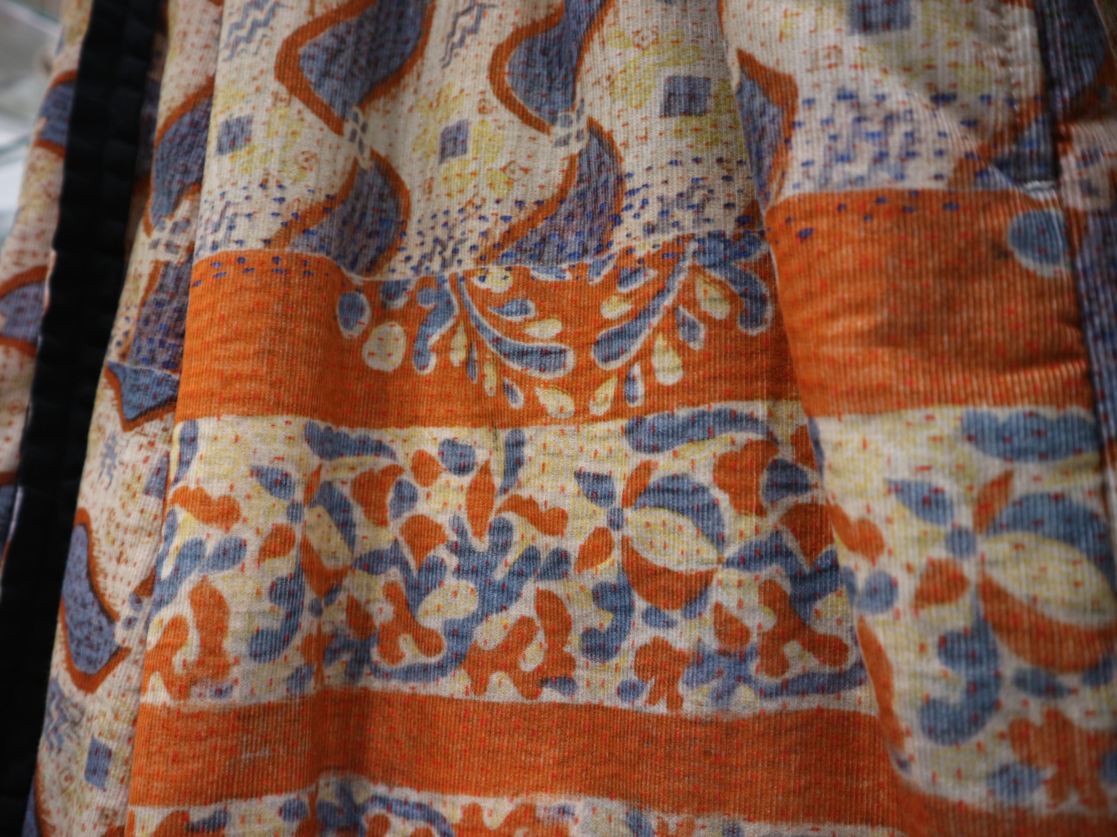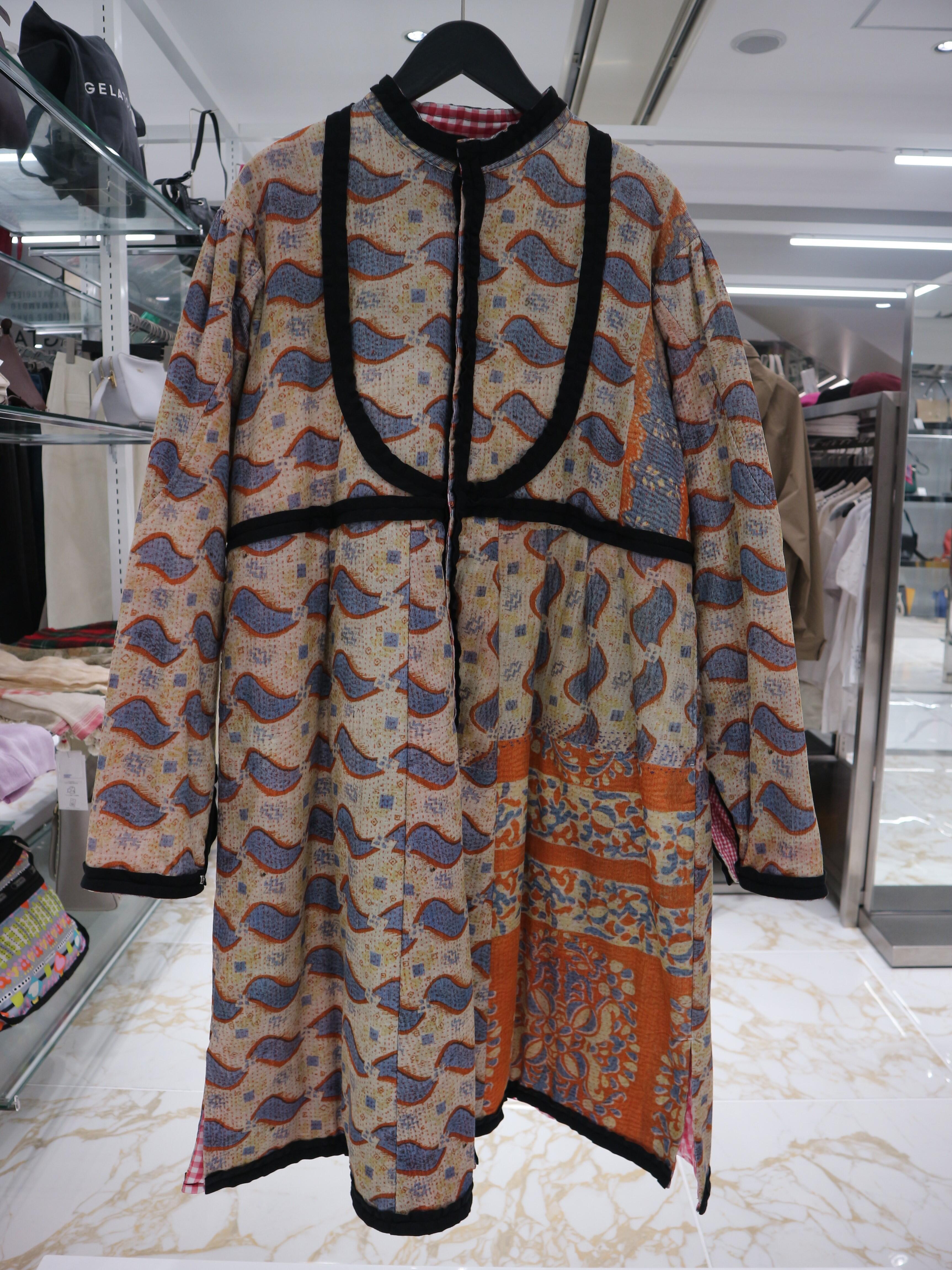 個人的には、キルティングジャケットを羽織ったような厚みと感じました!民族調の雰囲気が感じられる幾何学模様。左下にはさり気なく異なる柄がプラスされています!