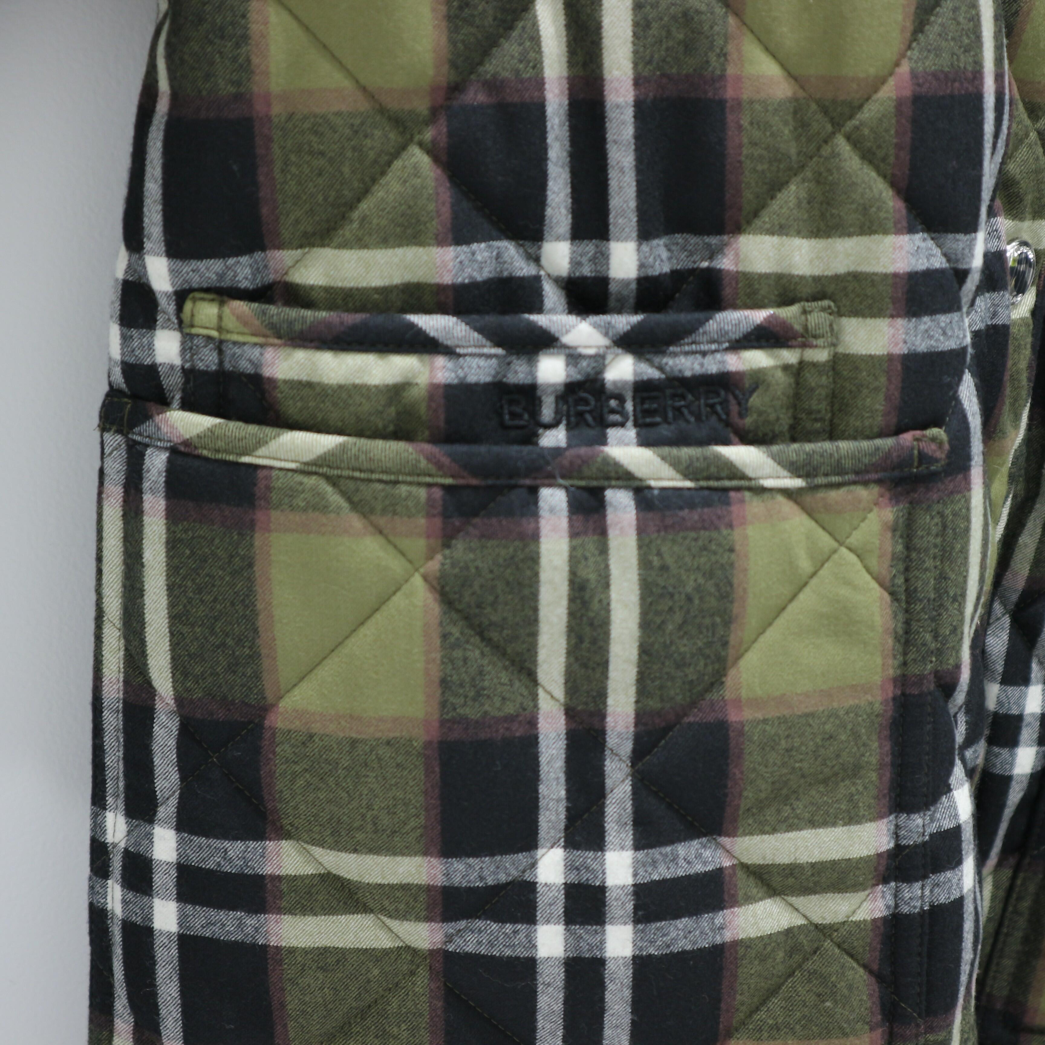 襟付きのキルティングジャケットで、左側のポケットがダブルになっており、内側のポケットにBURBERRYの刺繍があります。全体的にカジュアルな雰囲気のアイテムなので、様々な世代の方でも着用できます。