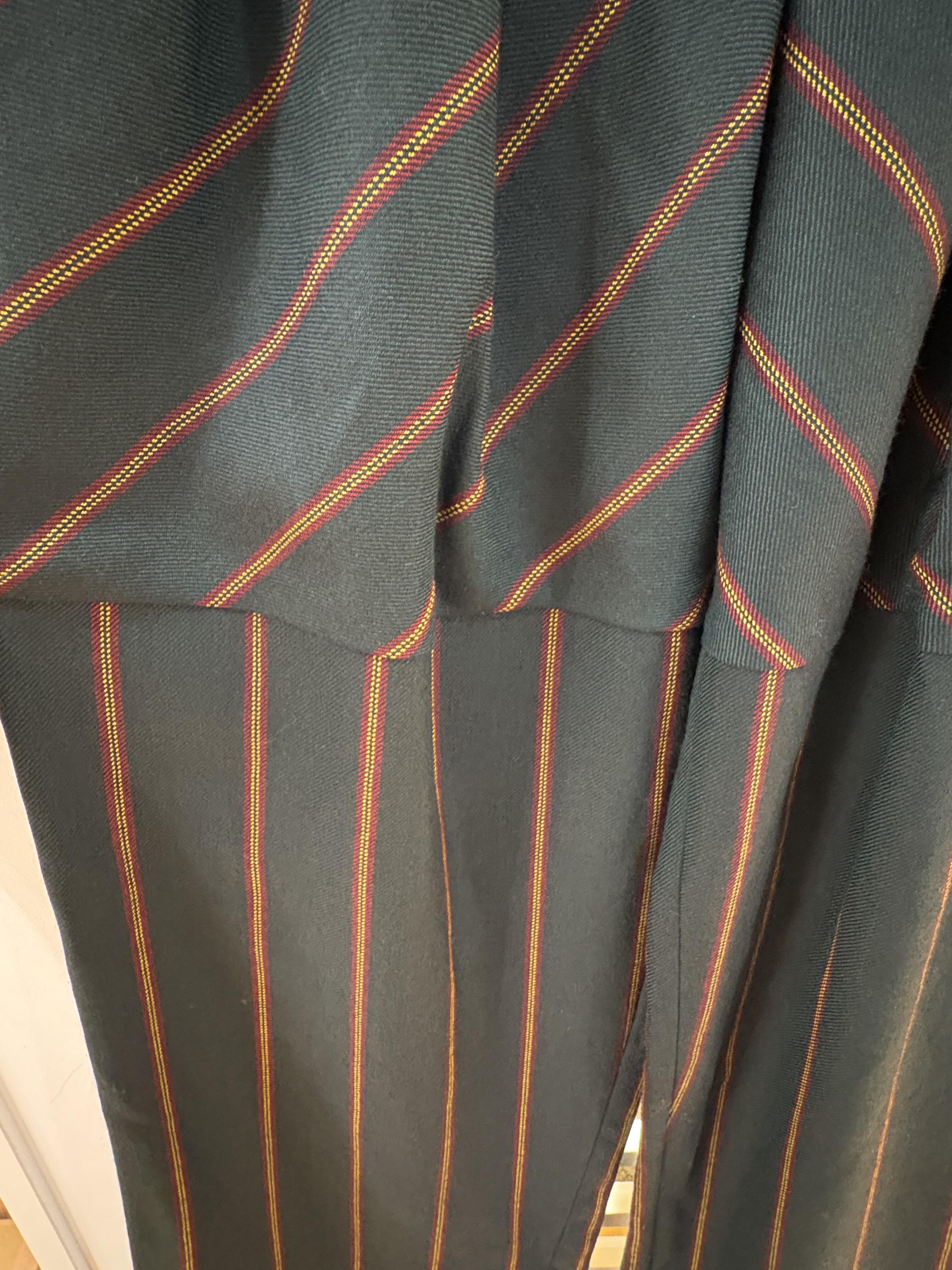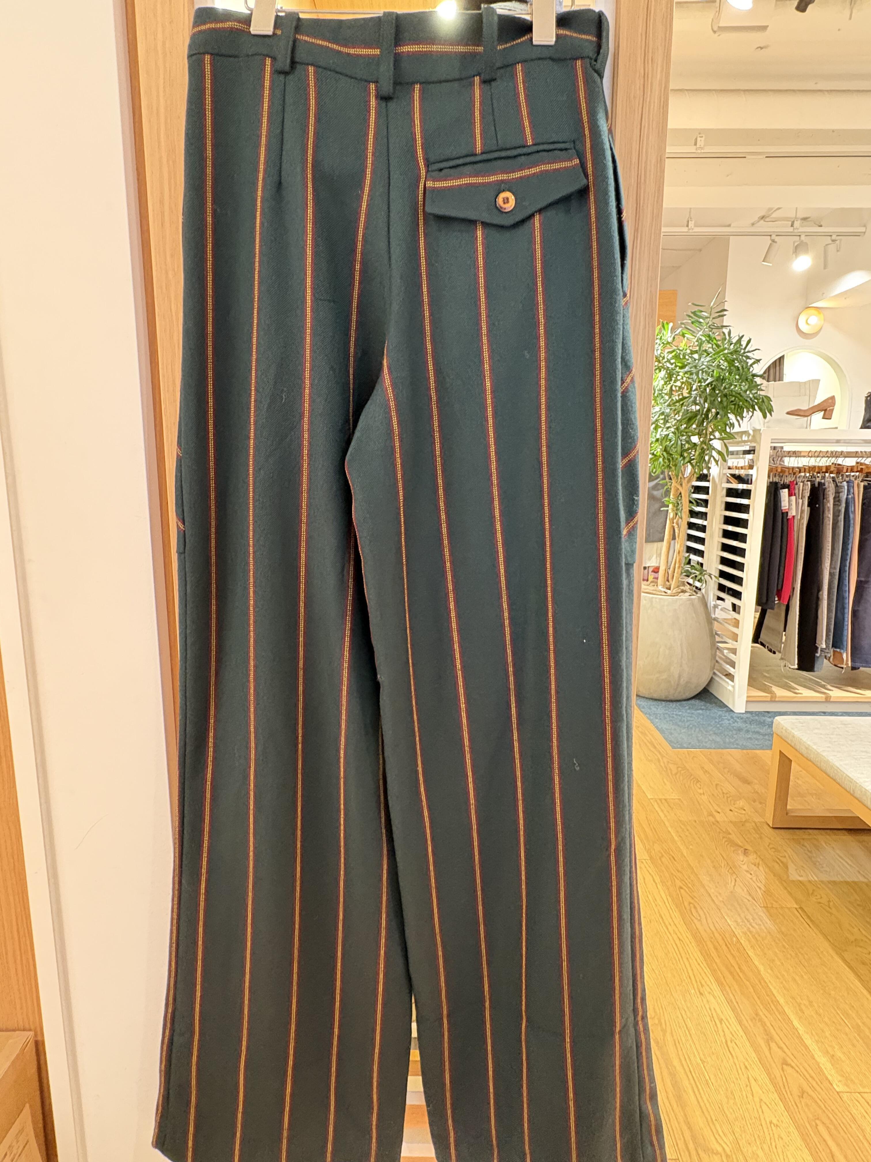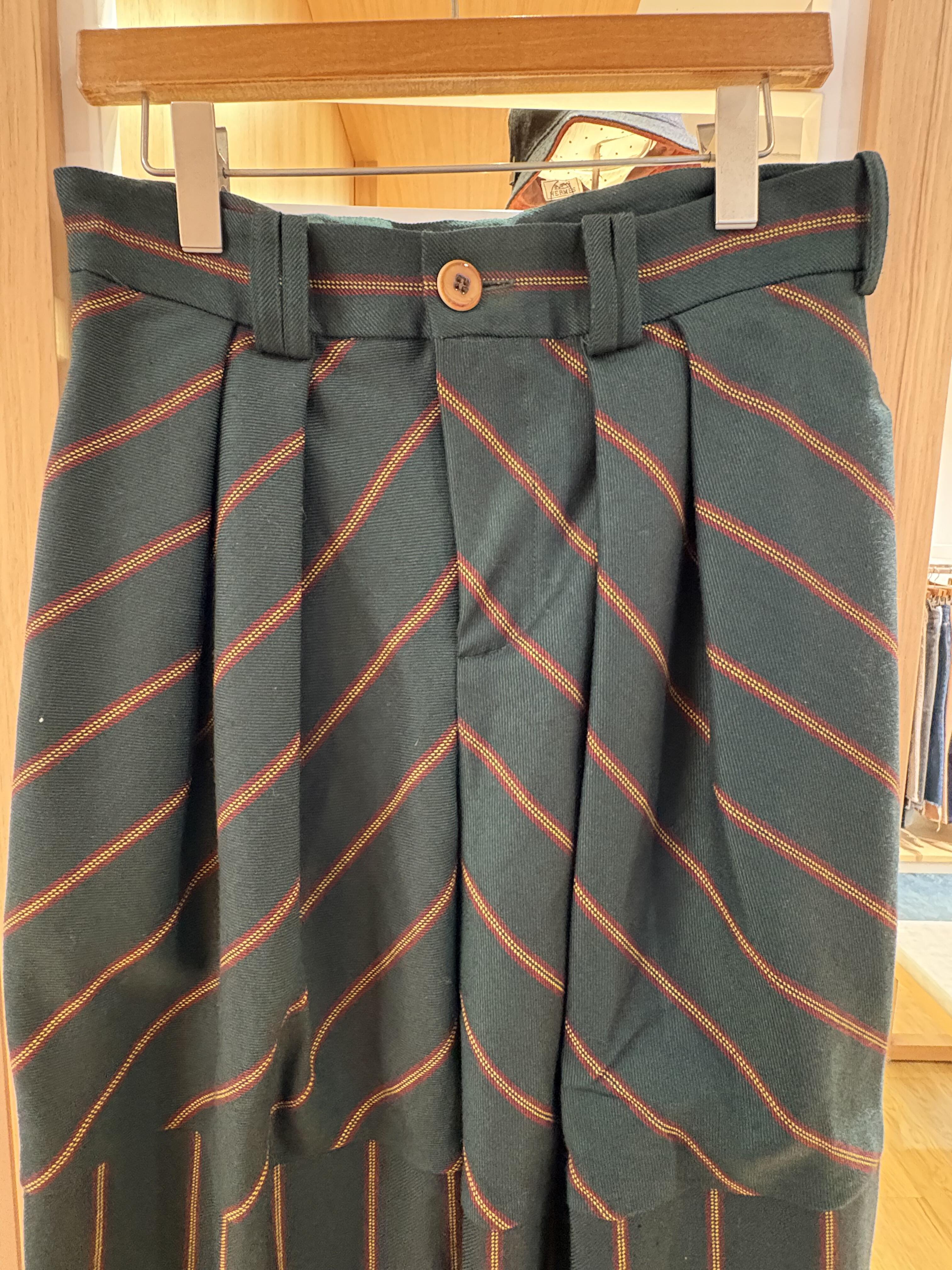 今回のアイテムでもデッドストックのウール生地を使用。柄もパブリックスクールの制服にありそうなトラッドなストライプ。