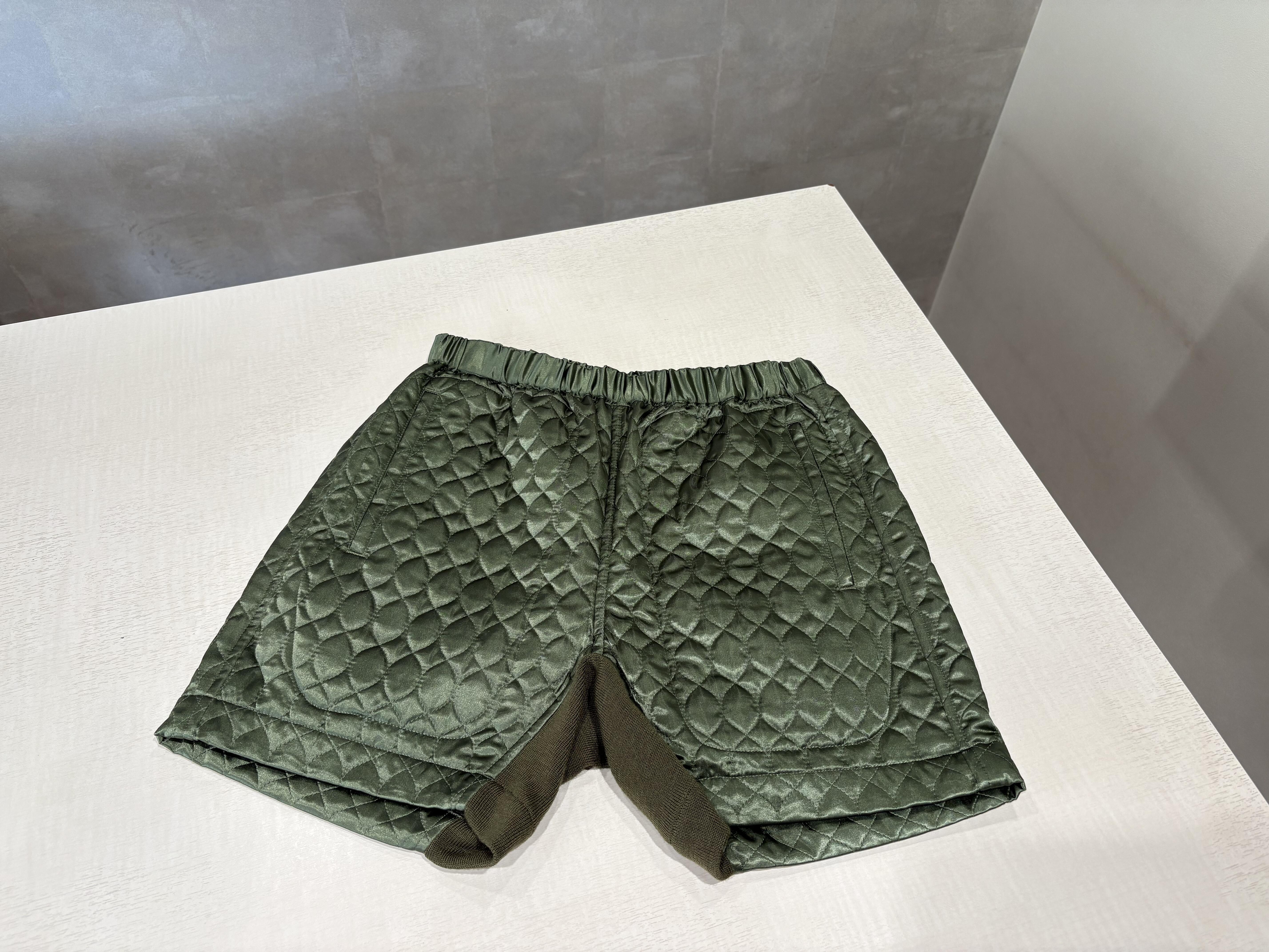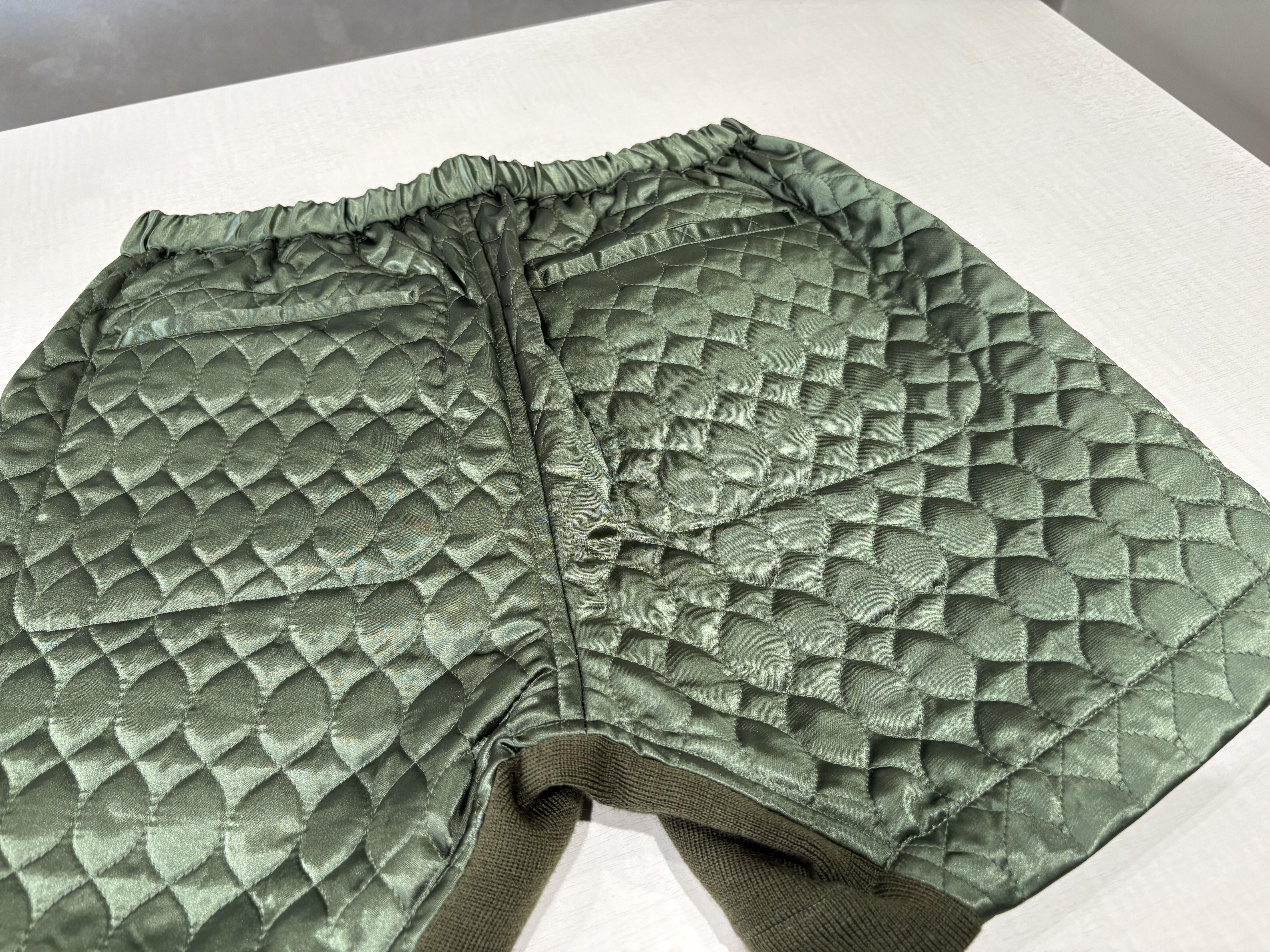 光沢のあるキルティング素材に、ニット素材がドッキングされているカーキのショートパンツ。