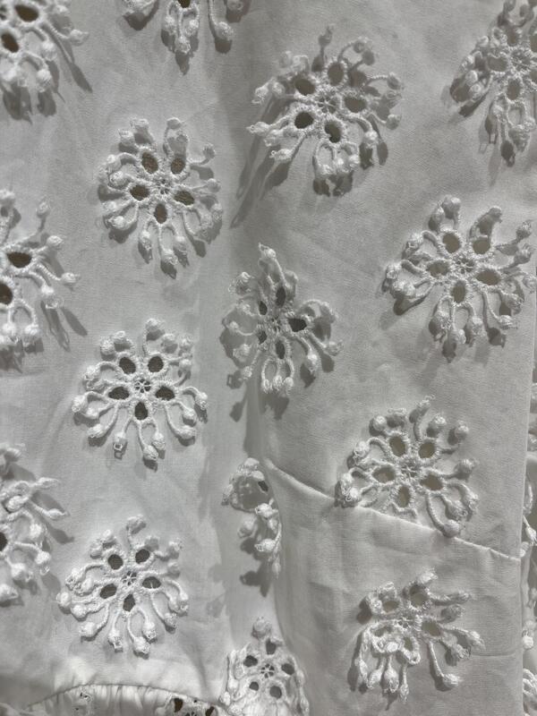 全体にあしらわれたレース刺繍がロマンチックムードに拍車をかけ、白一色とは思えない立体感がポイント。