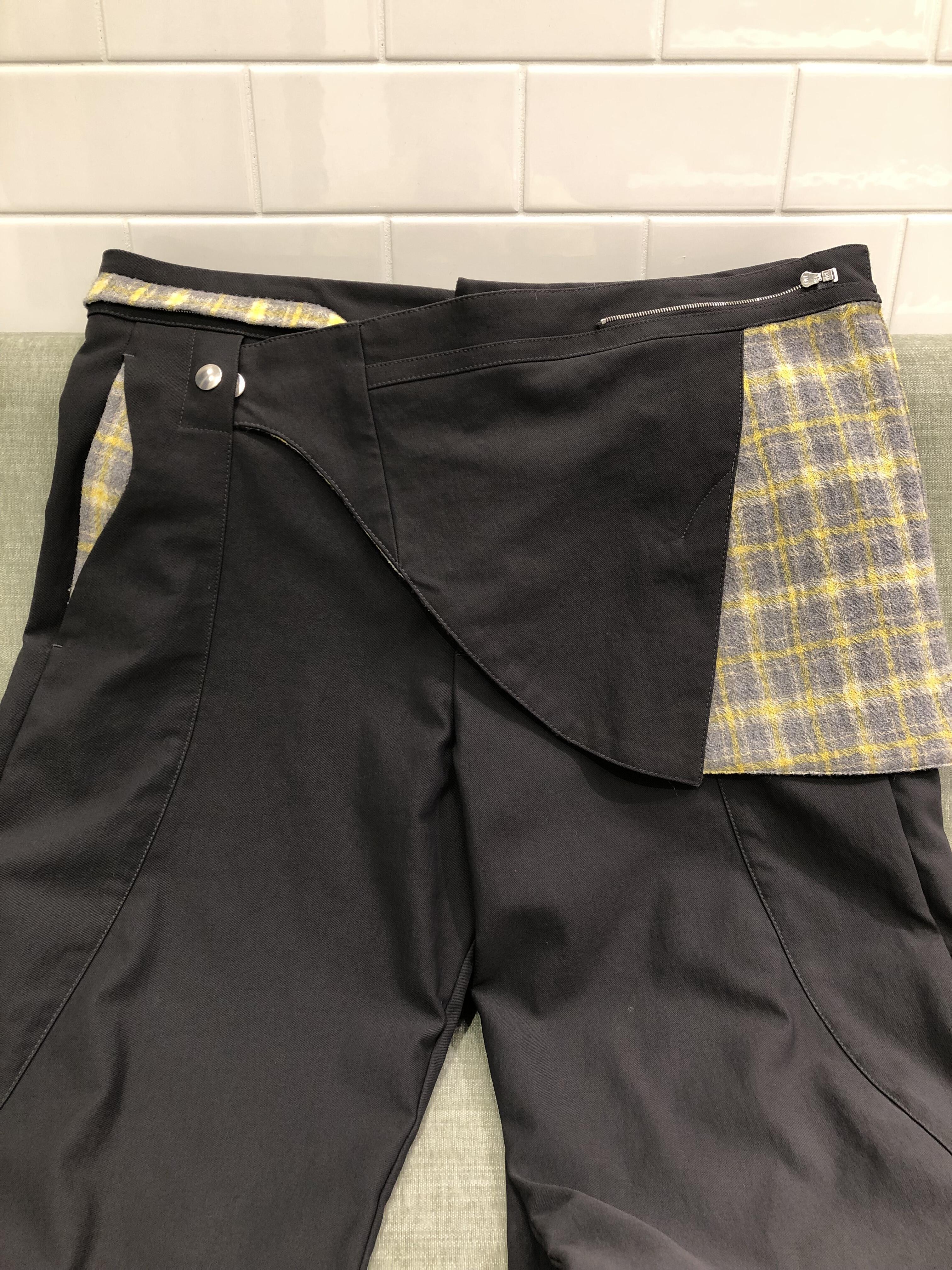 取り付け位置によって切り替え生地の分量が変わり、全く違った印象に見えてきます。(個人的にはチェック柄が多く見える方が好みです。)
