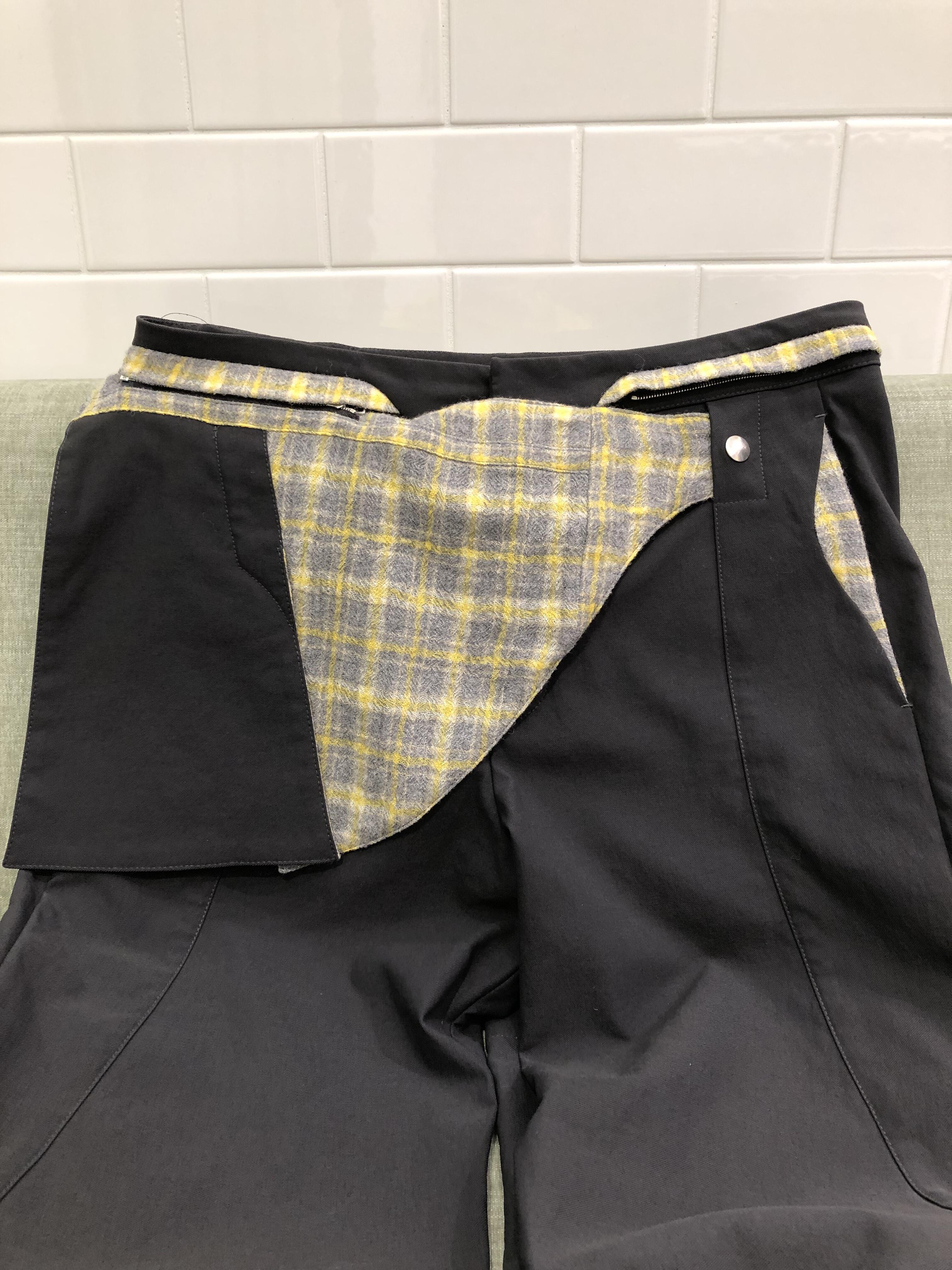 ブランドらしい左右非対称の印象を生み出しています。こちらはジップとスナップボタンによって取り外しが可能で、左右どちらの向きにも取り付けが可能です。チェック柄の部分はウールファブリックが用いられており、カントリーな印象。メインのモダンでアーバンな印象のチャコールグレーのナイロン地との絶妙なコントラストが心地いいです。