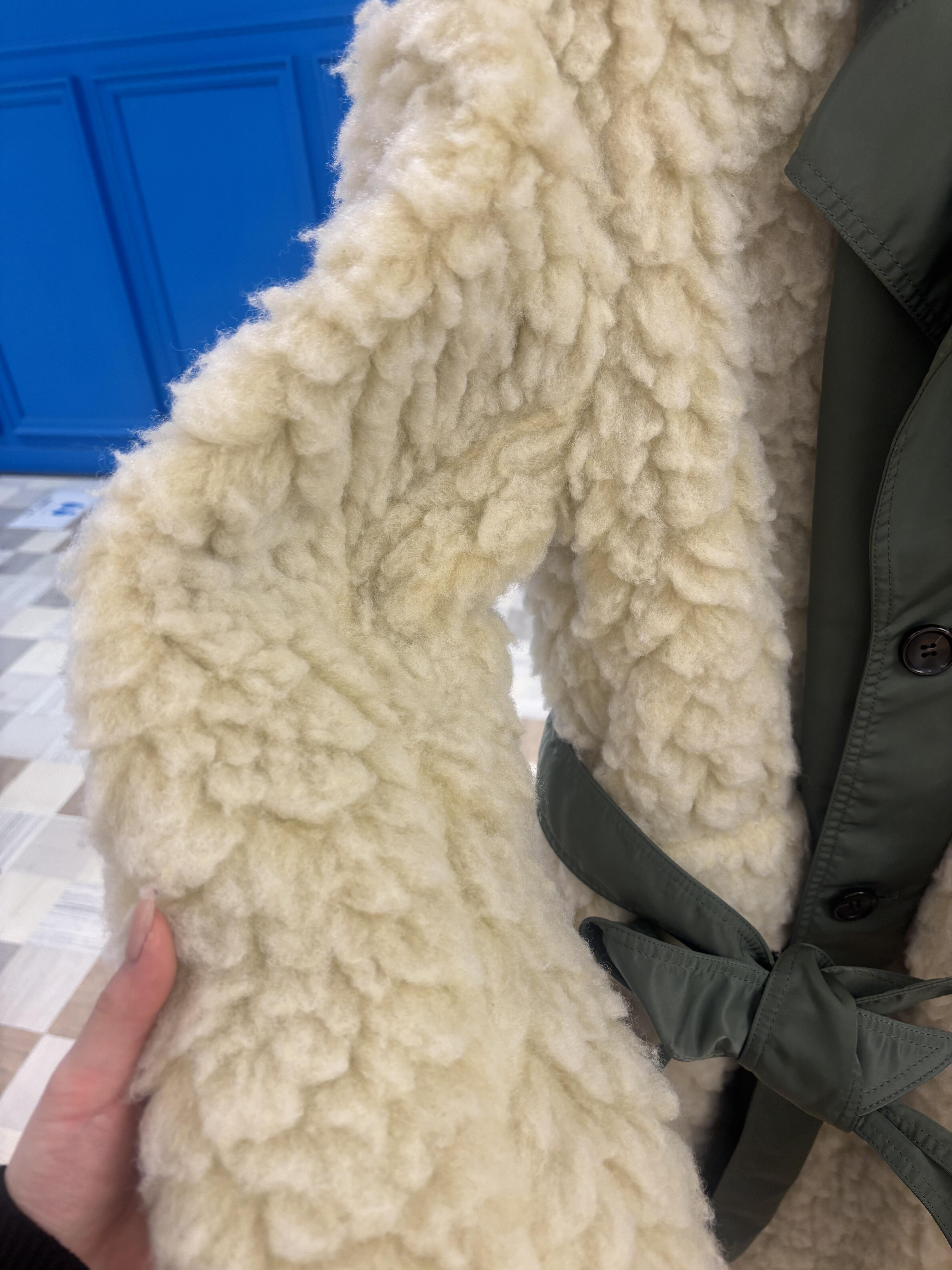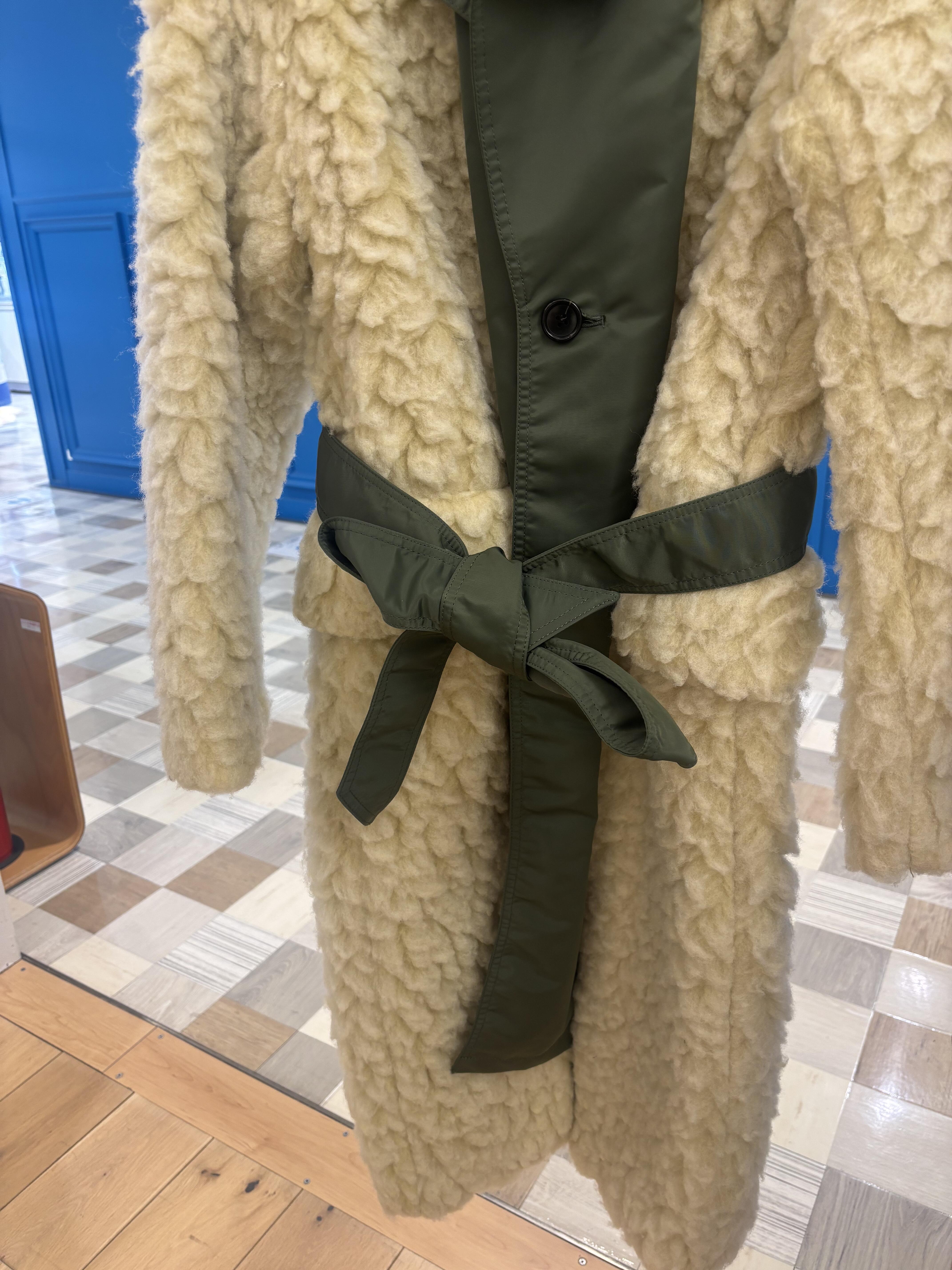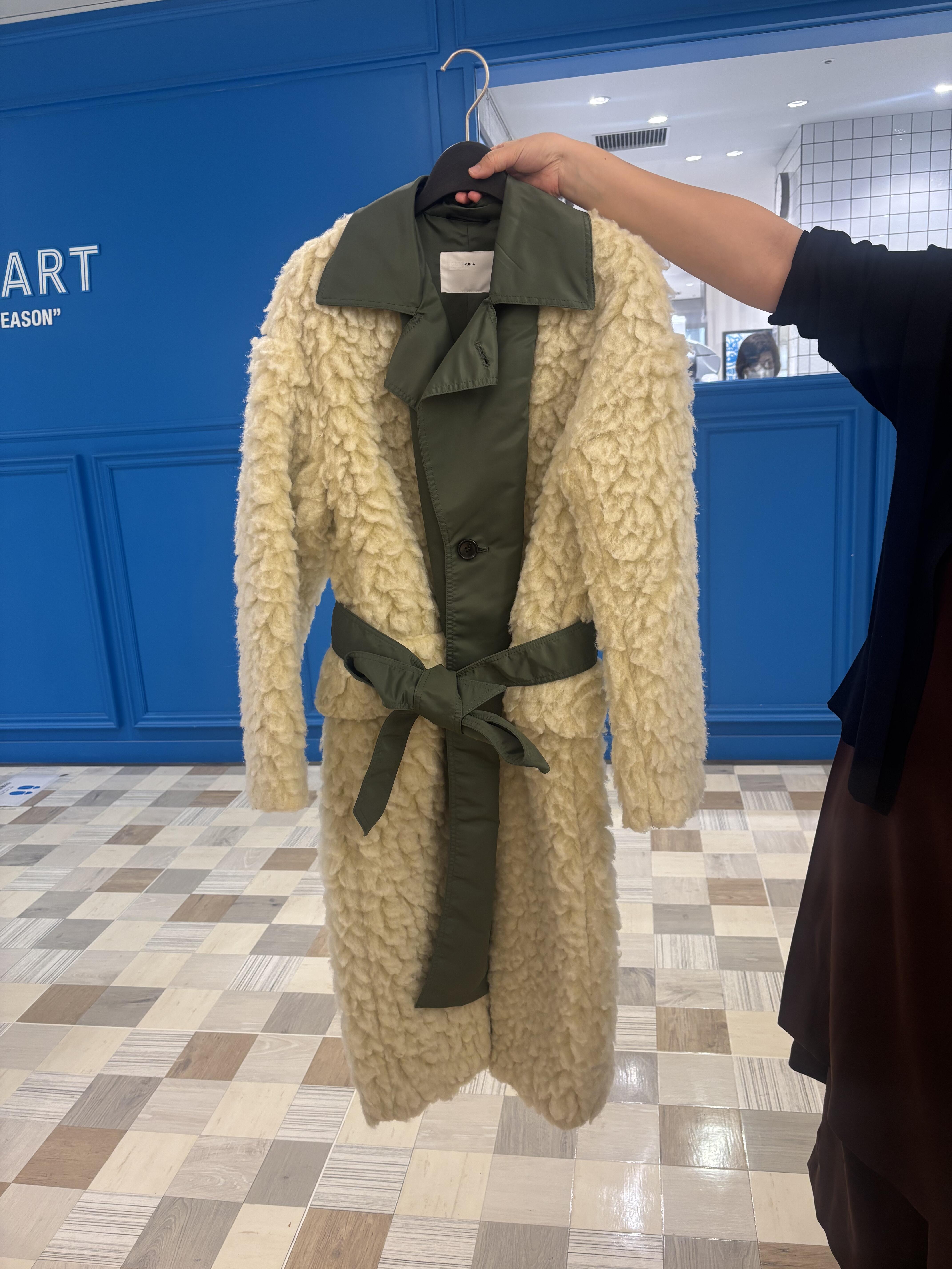 ボアブルゾンの中にトレンチコートを重ねたようなデザインになっています。