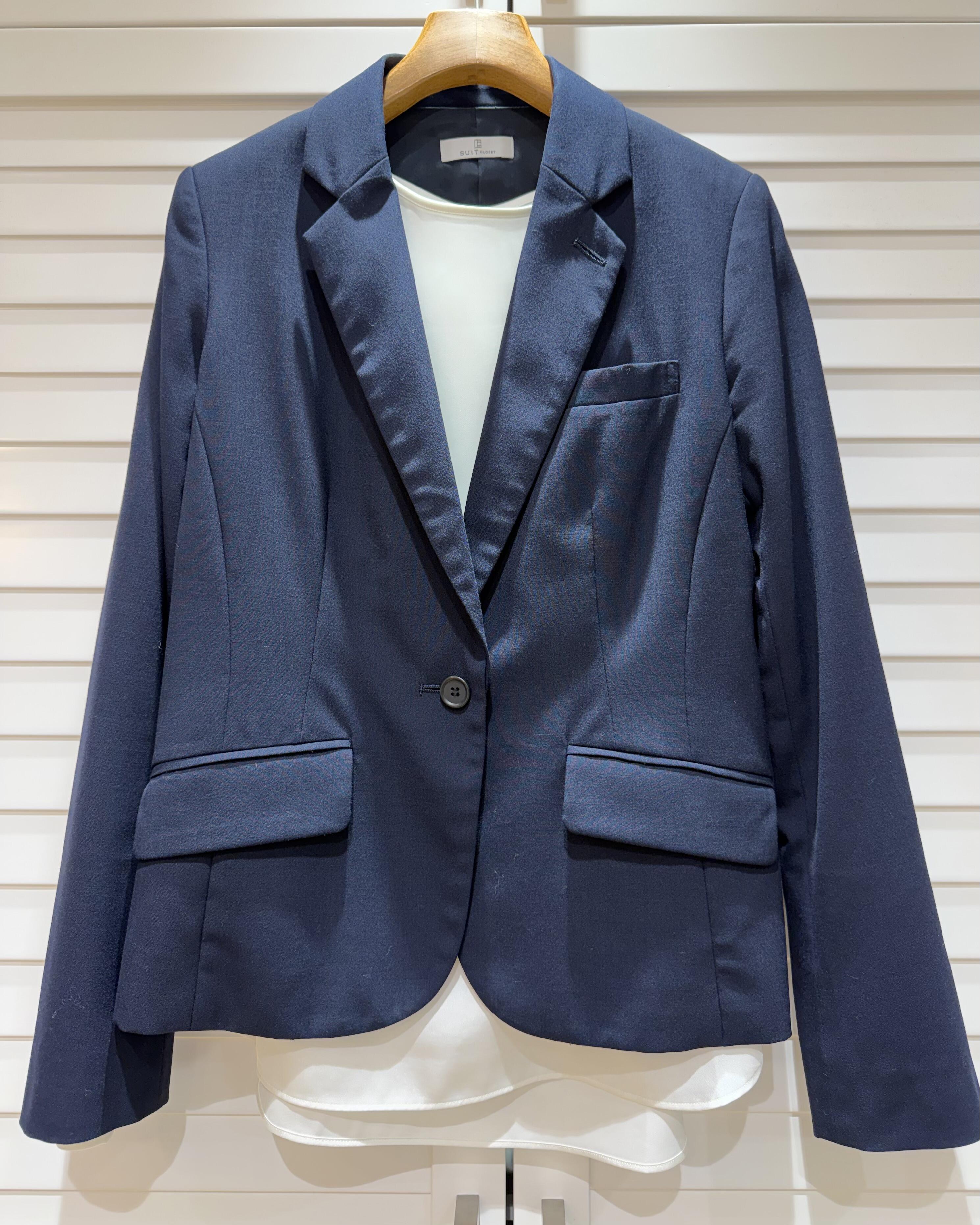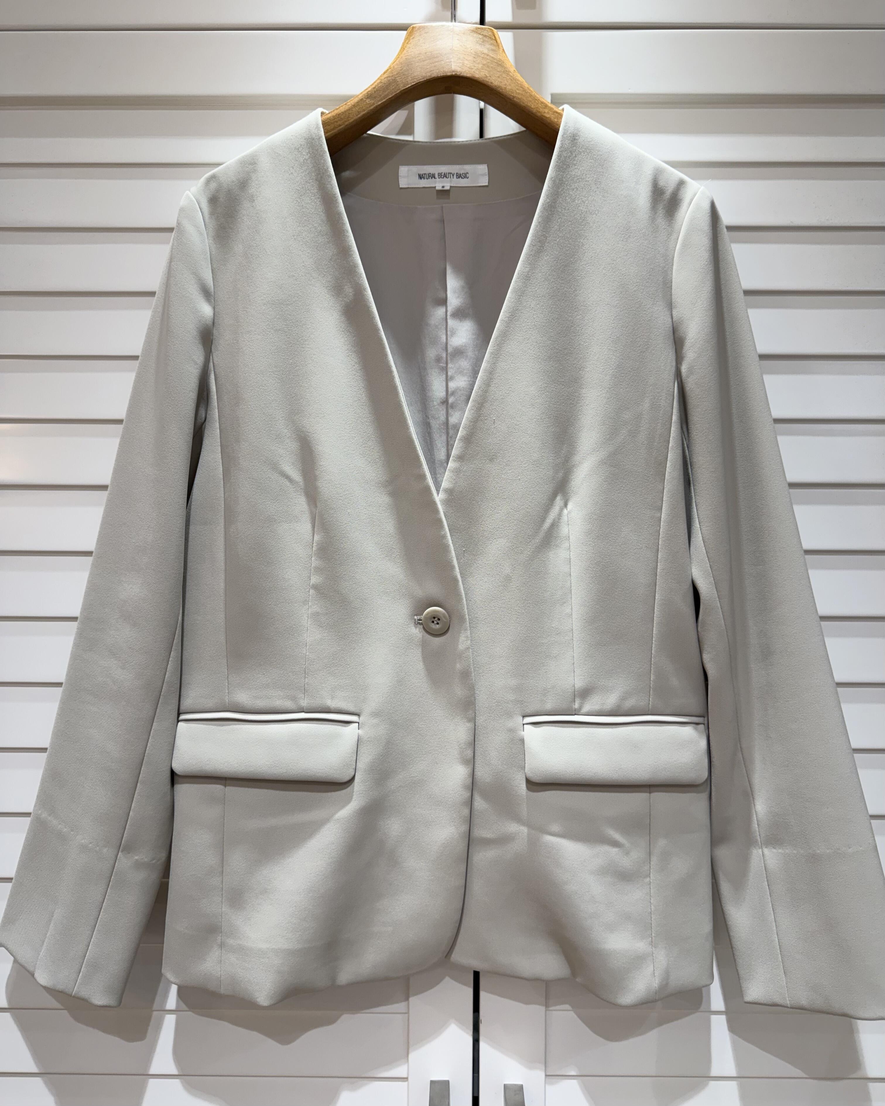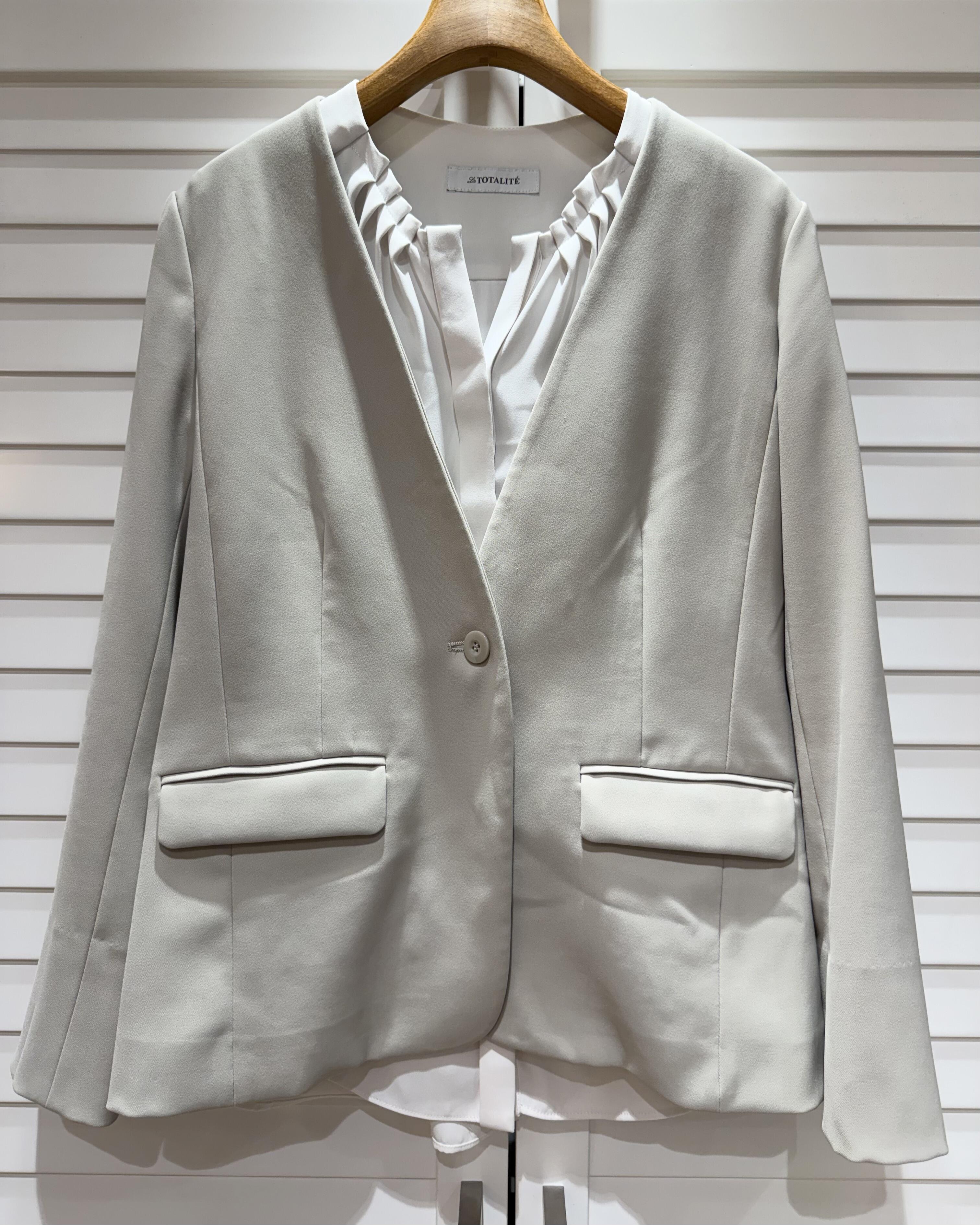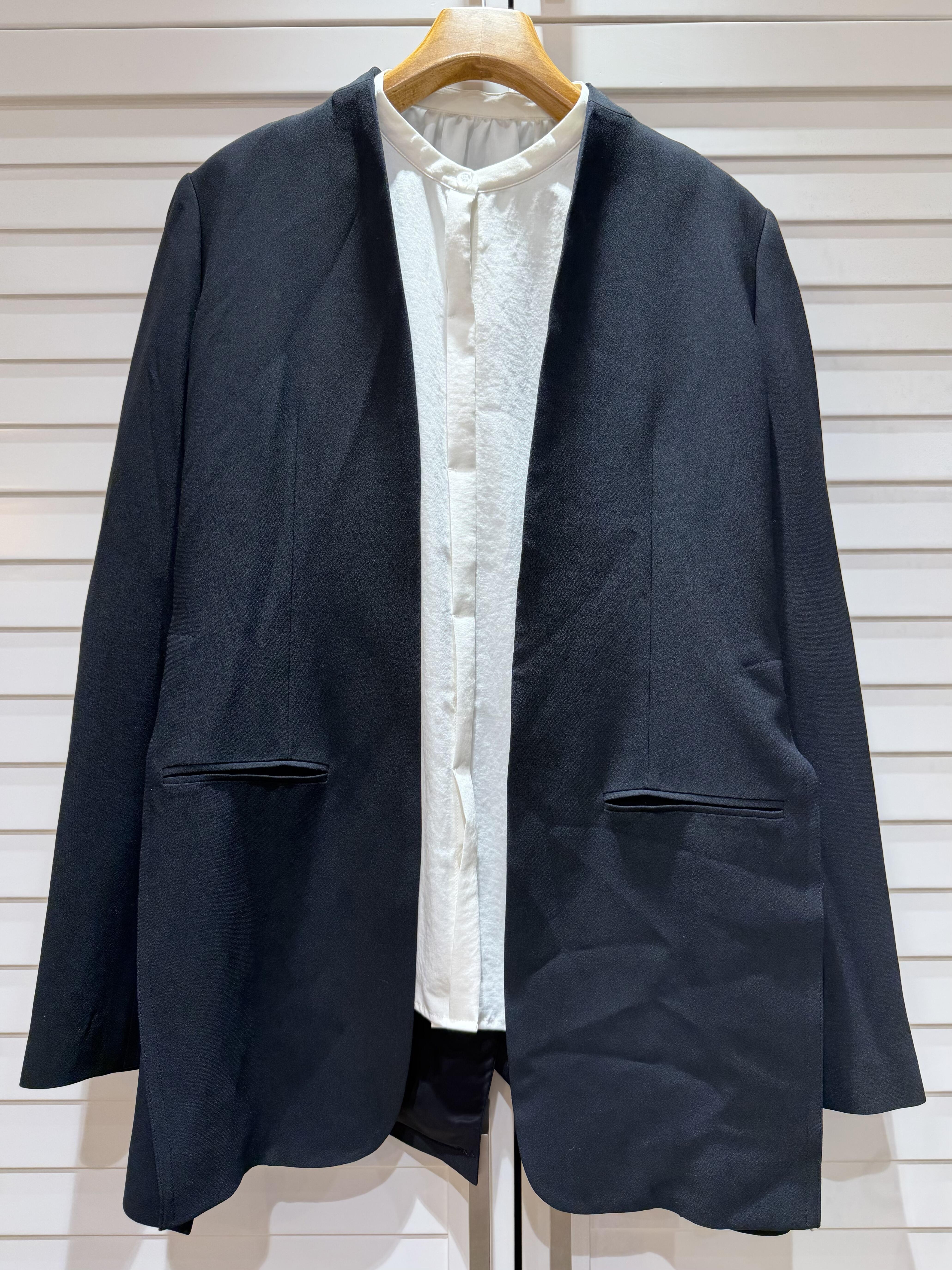 こちらもノーカラージャケットではあるのですが、先ほどのベージュのジャケットとはまた全く違った印象。