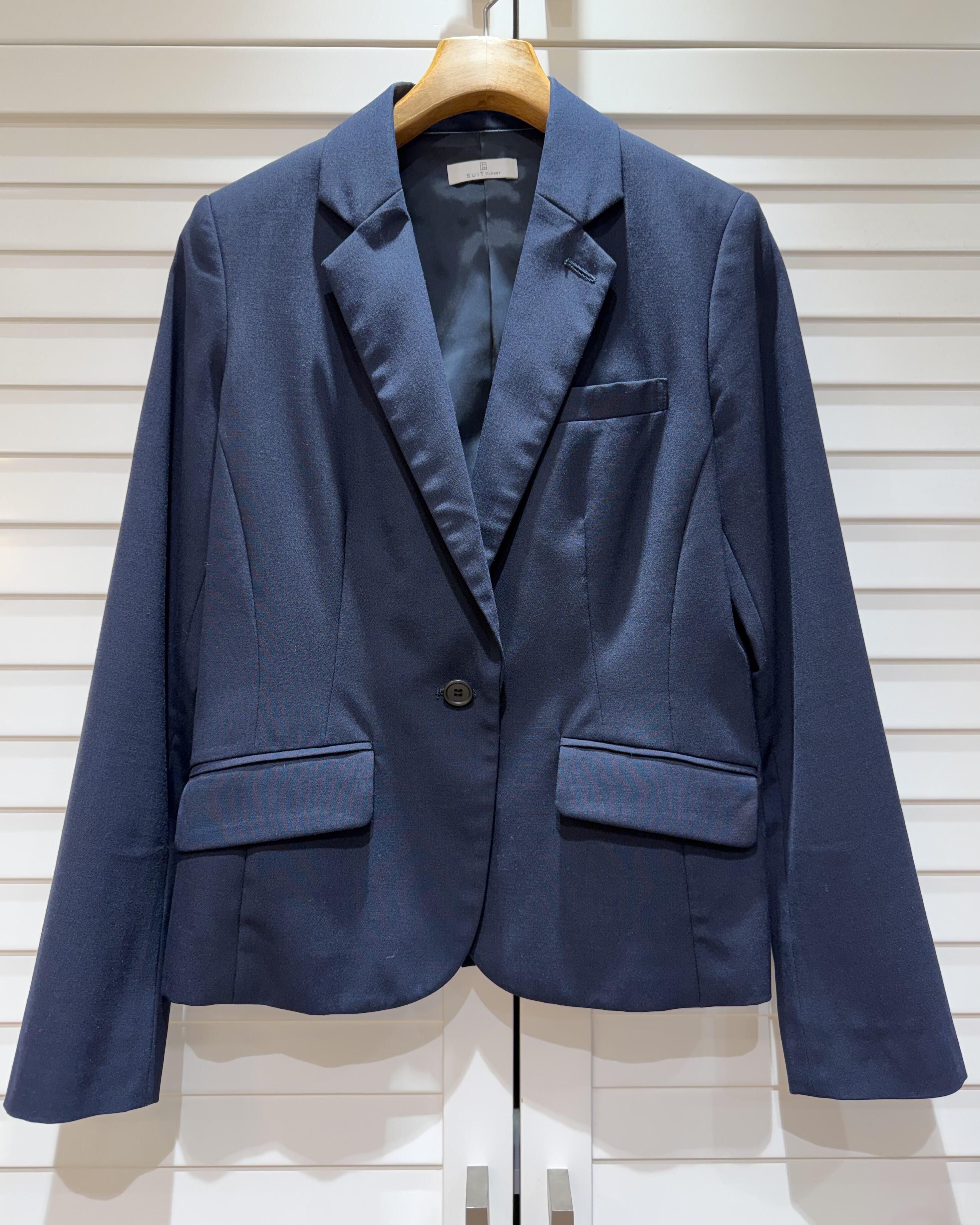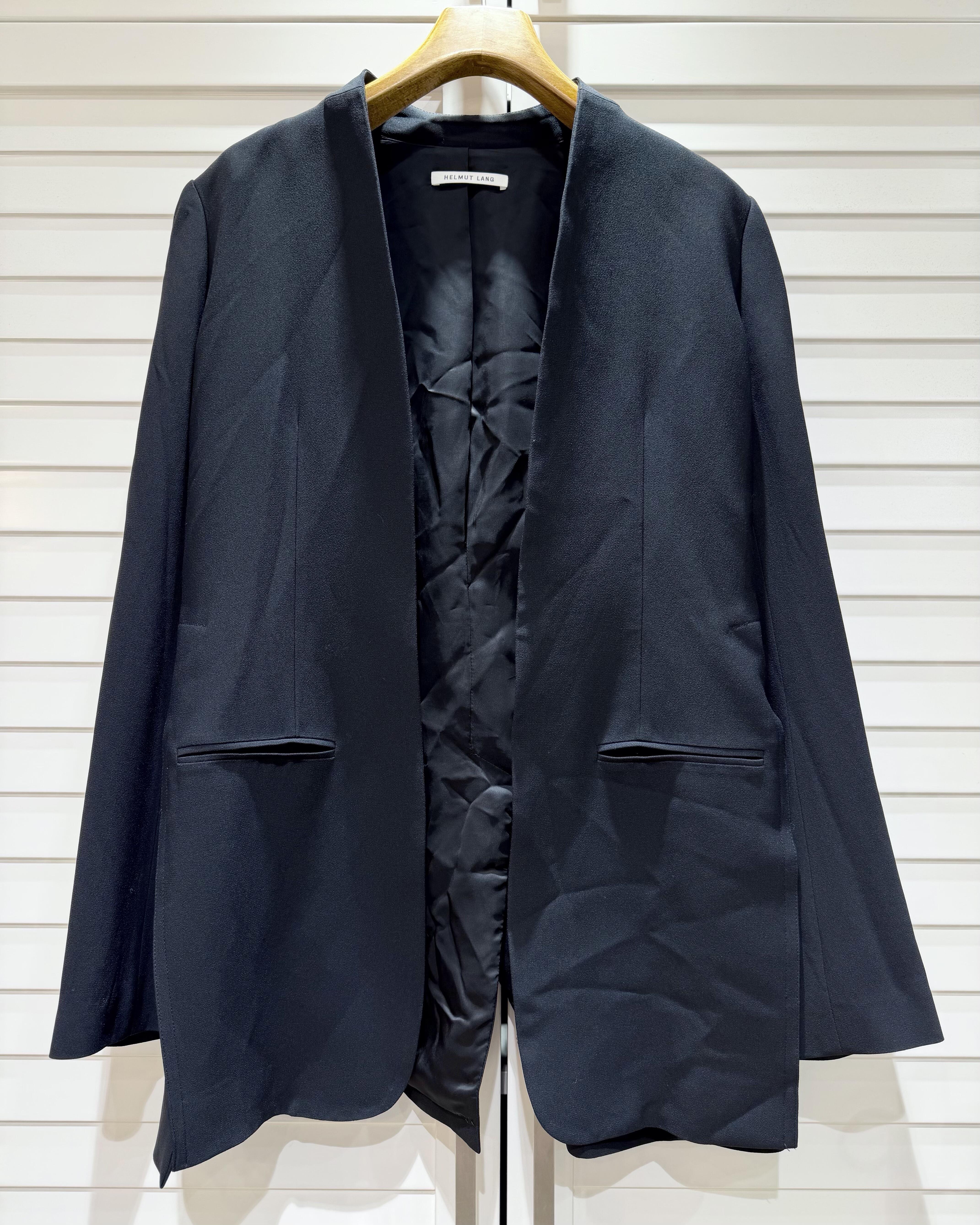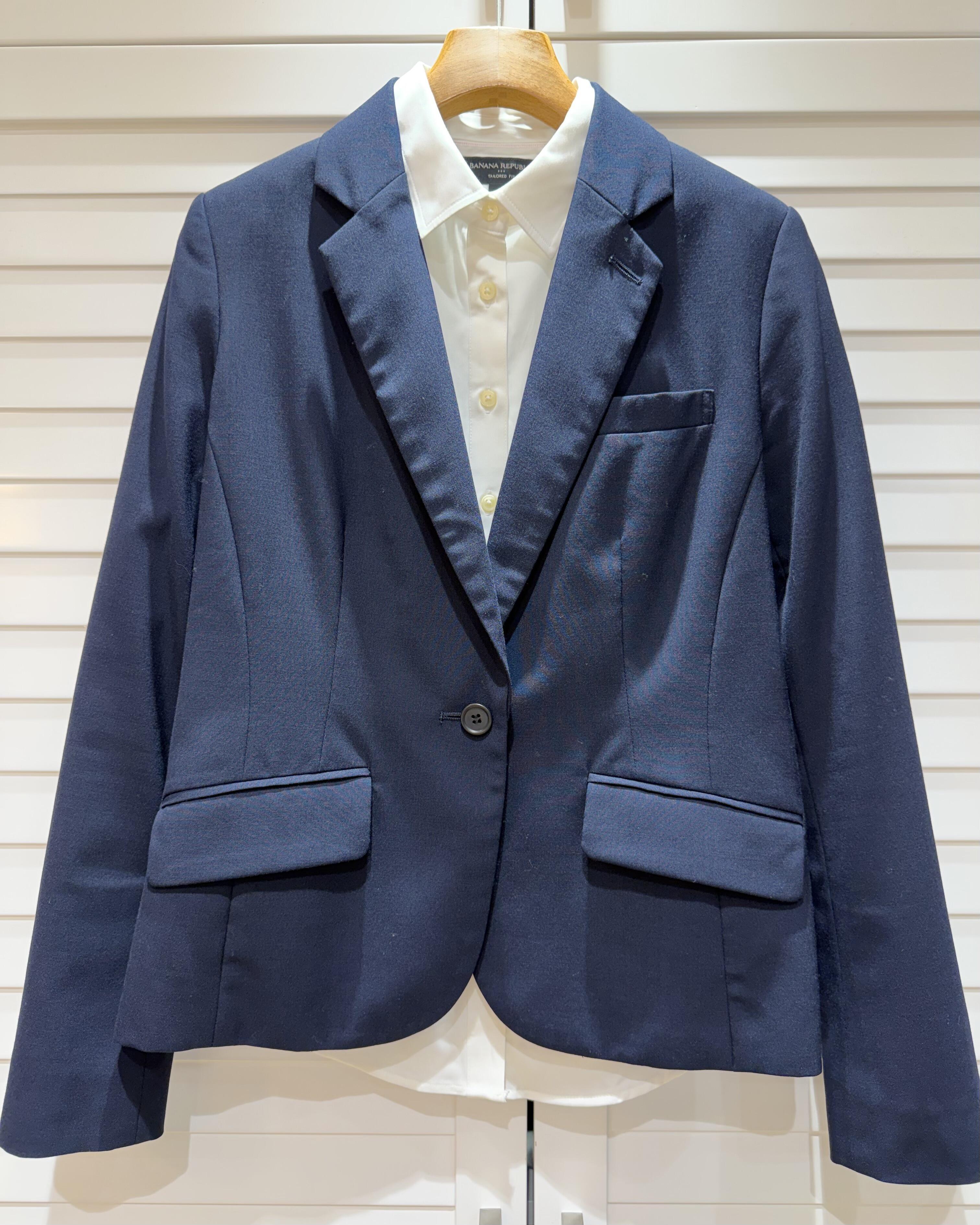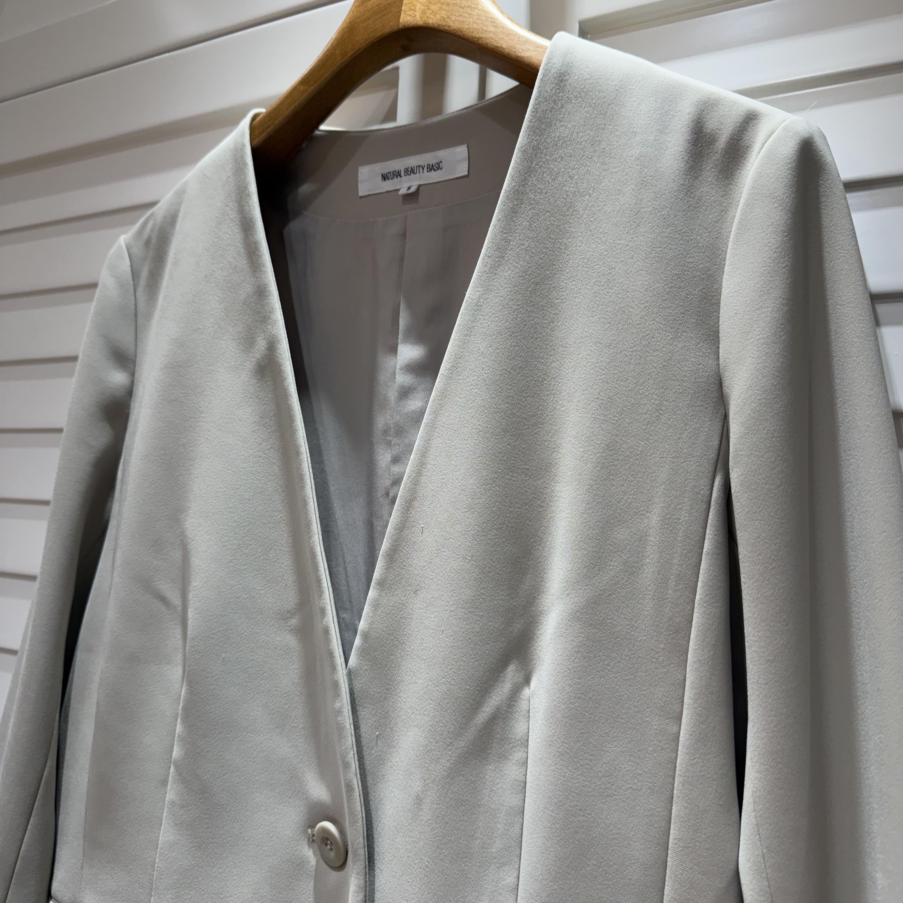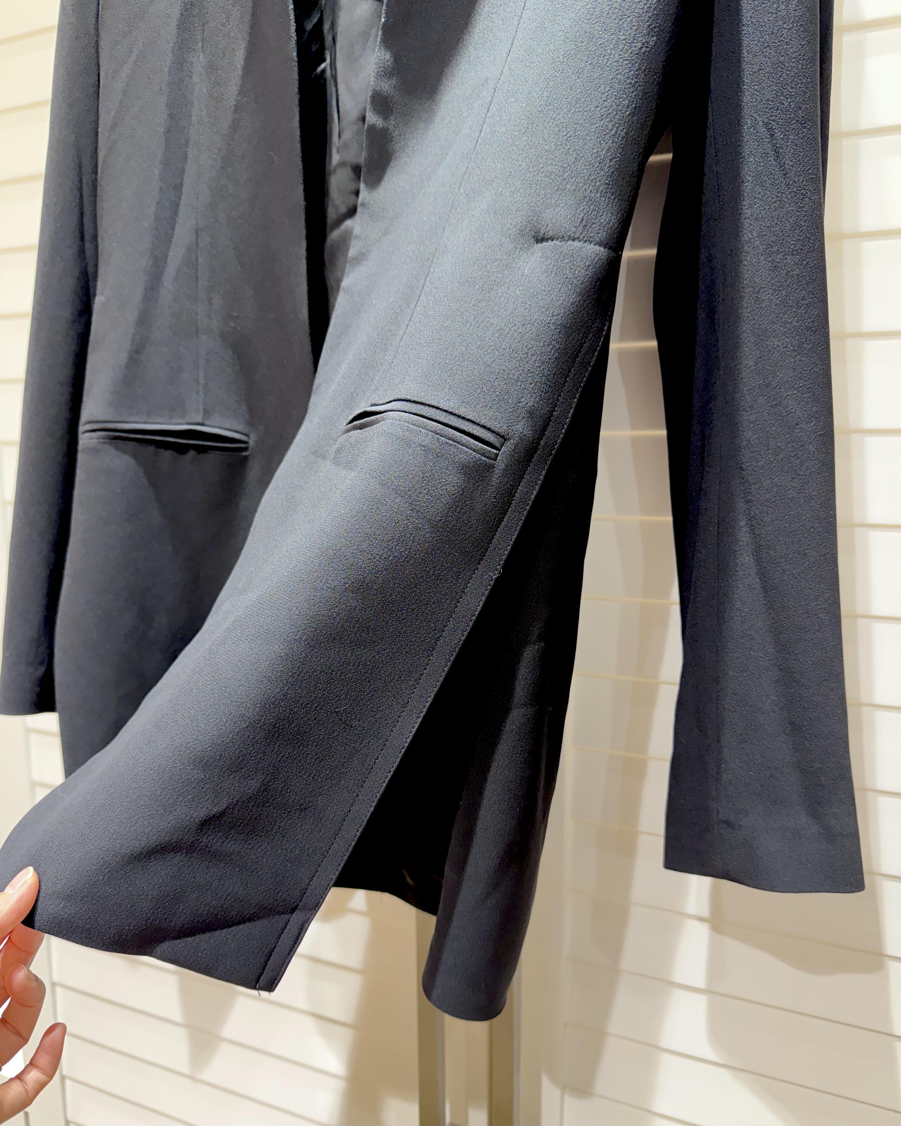 こちらもノーカラージャケットではあるのですが、先ほどのベージュのジャケットとはまた全く違った印象。