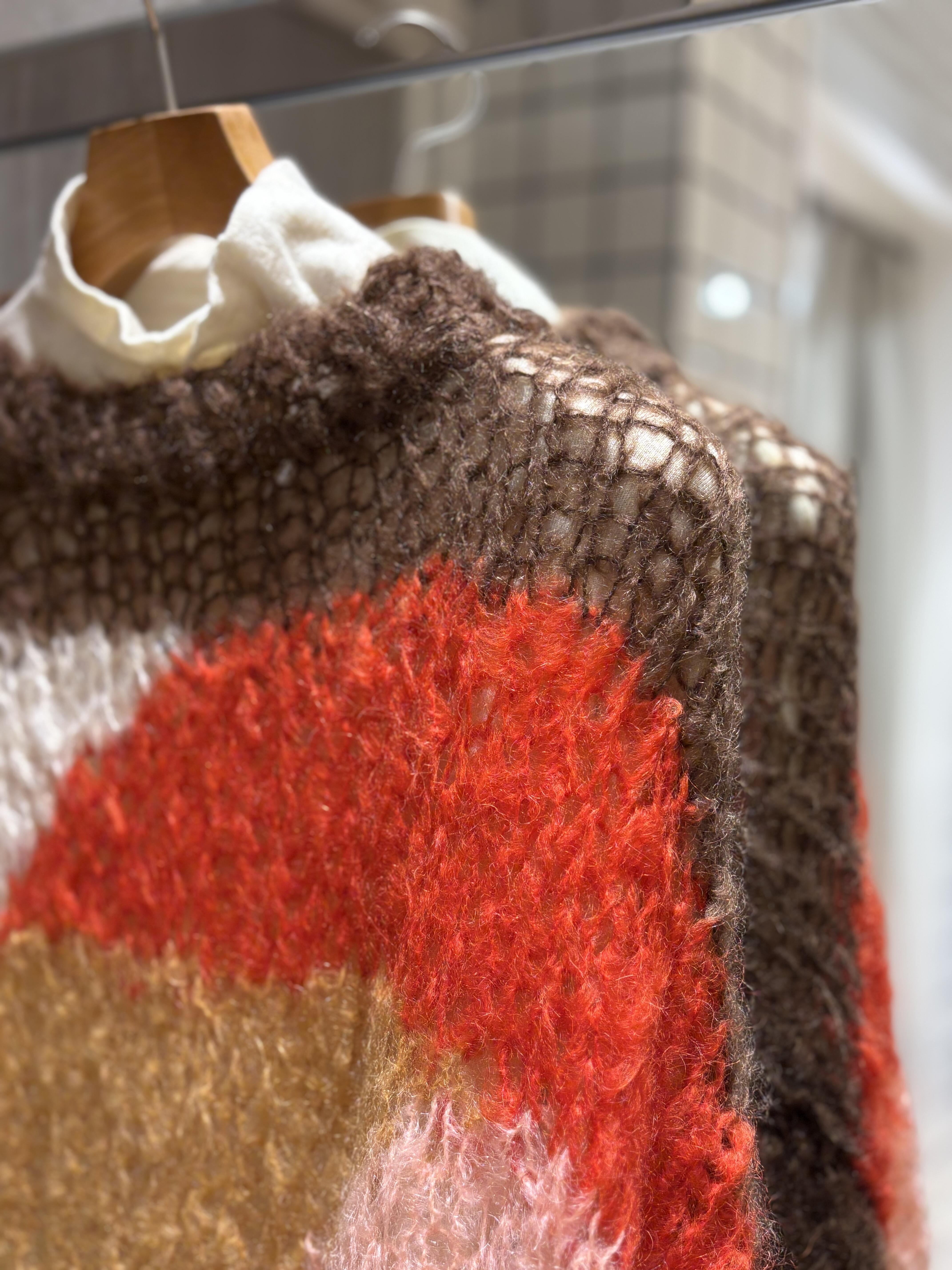 辻原:このニットの魅力は何といてもこの大ぶりな編地です!かなりロ―ゲージでゆるく編まれている分、重ね着を楽しむことができます。ブランドの魅力としては、カジュアルとモードのバランス感でしょうか。ローゲージのニットは、グランジ的なイメージがありますが、糸の光沢感や配色で上品が演出されています。UNUSEDの表現の幅にはいつも驚かされます。