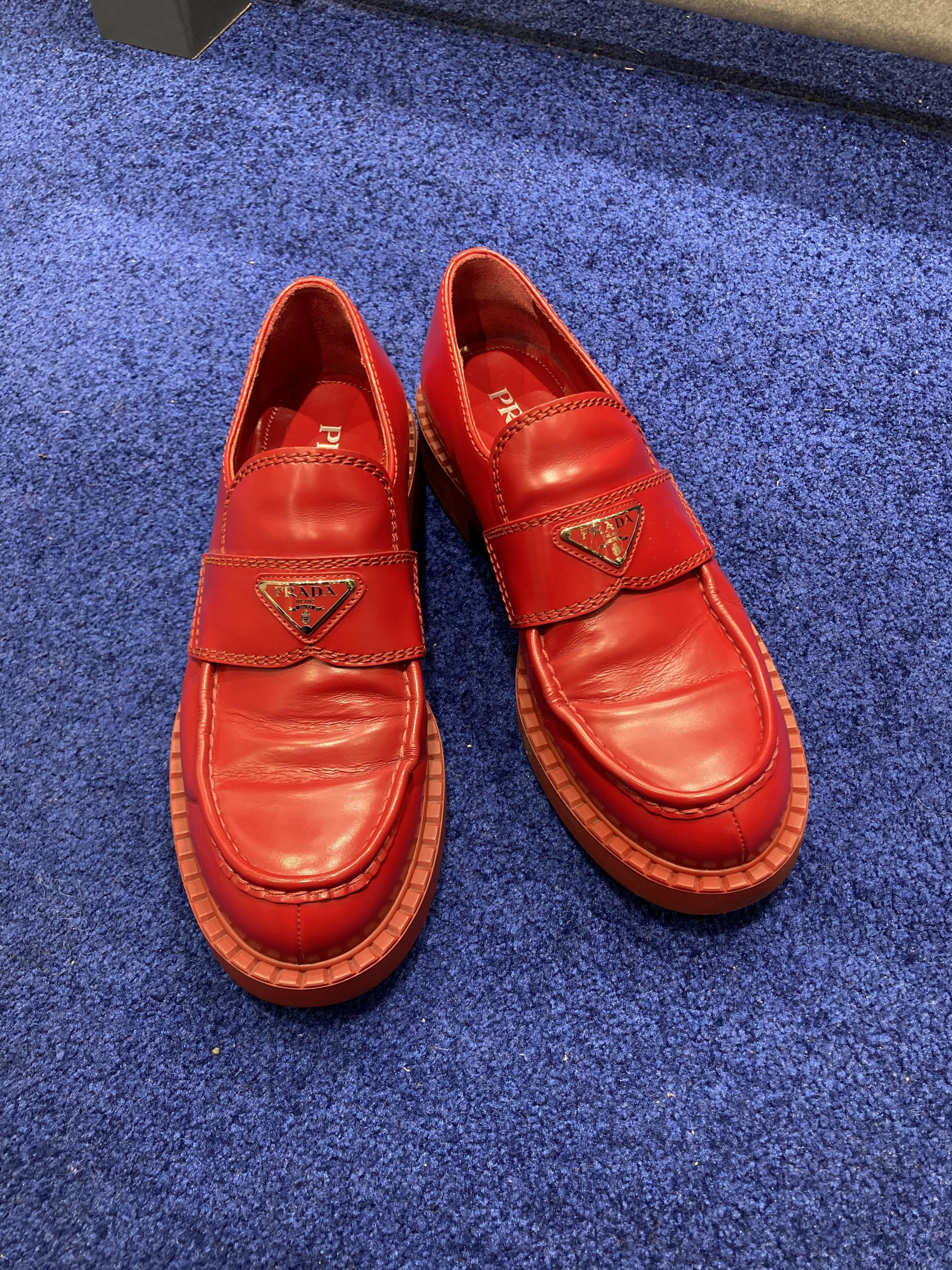 シンプルなコーディネートに合わせるだけで、足元から全体の印象を引き上げてくれる一足。逆に色で遊んでも負けない赤の発色とPRADAのロゴ。いろんな合わせが考えられてワクワクする一足かなと思います。