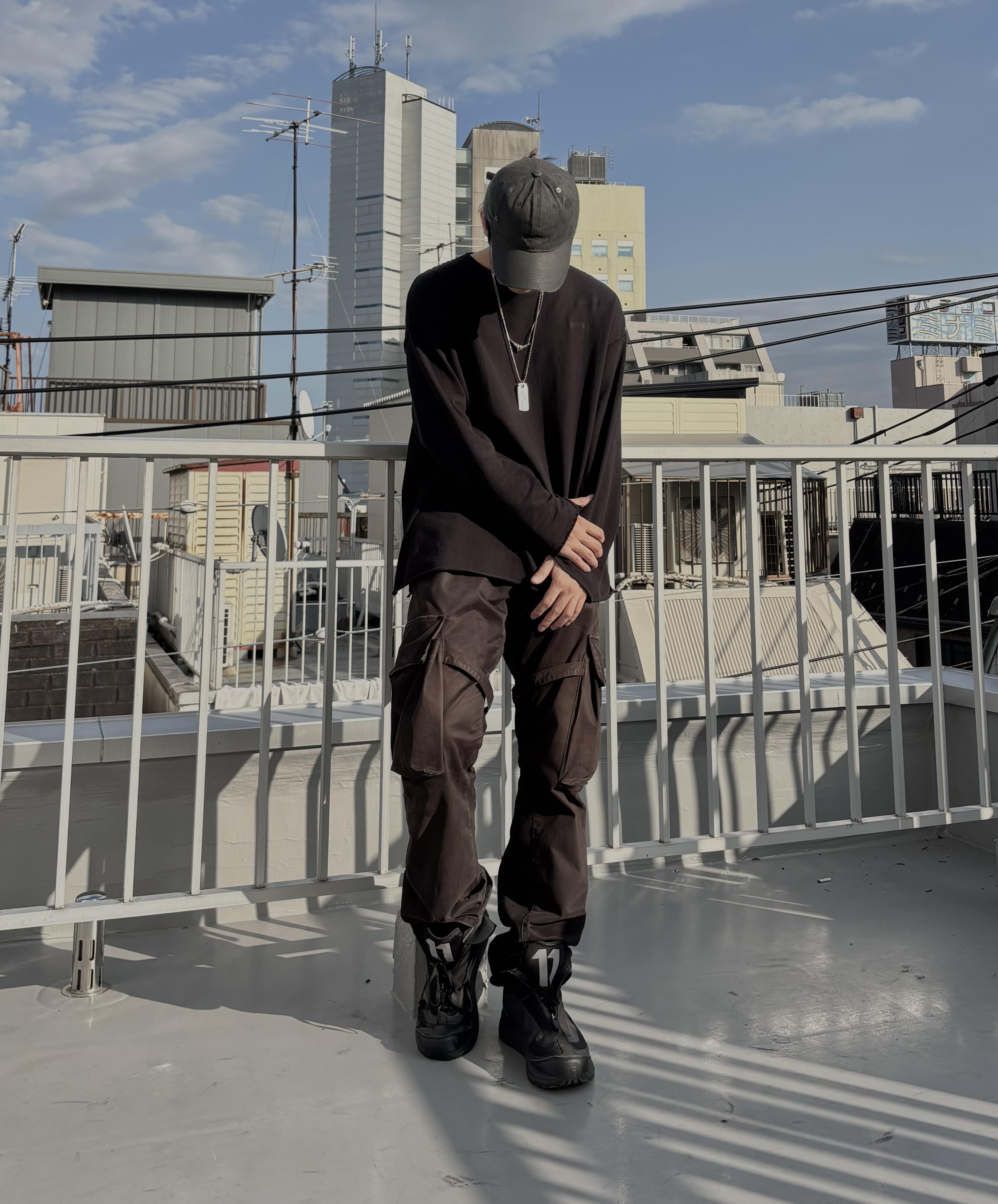 シンプルなロングスリーブのカットソーにカーゴパンツ、ラフなスタイルの足元にsalomonを採用することでアクティブで抜け感がありつつ、バランスのいいスタイリングに仕上がります。