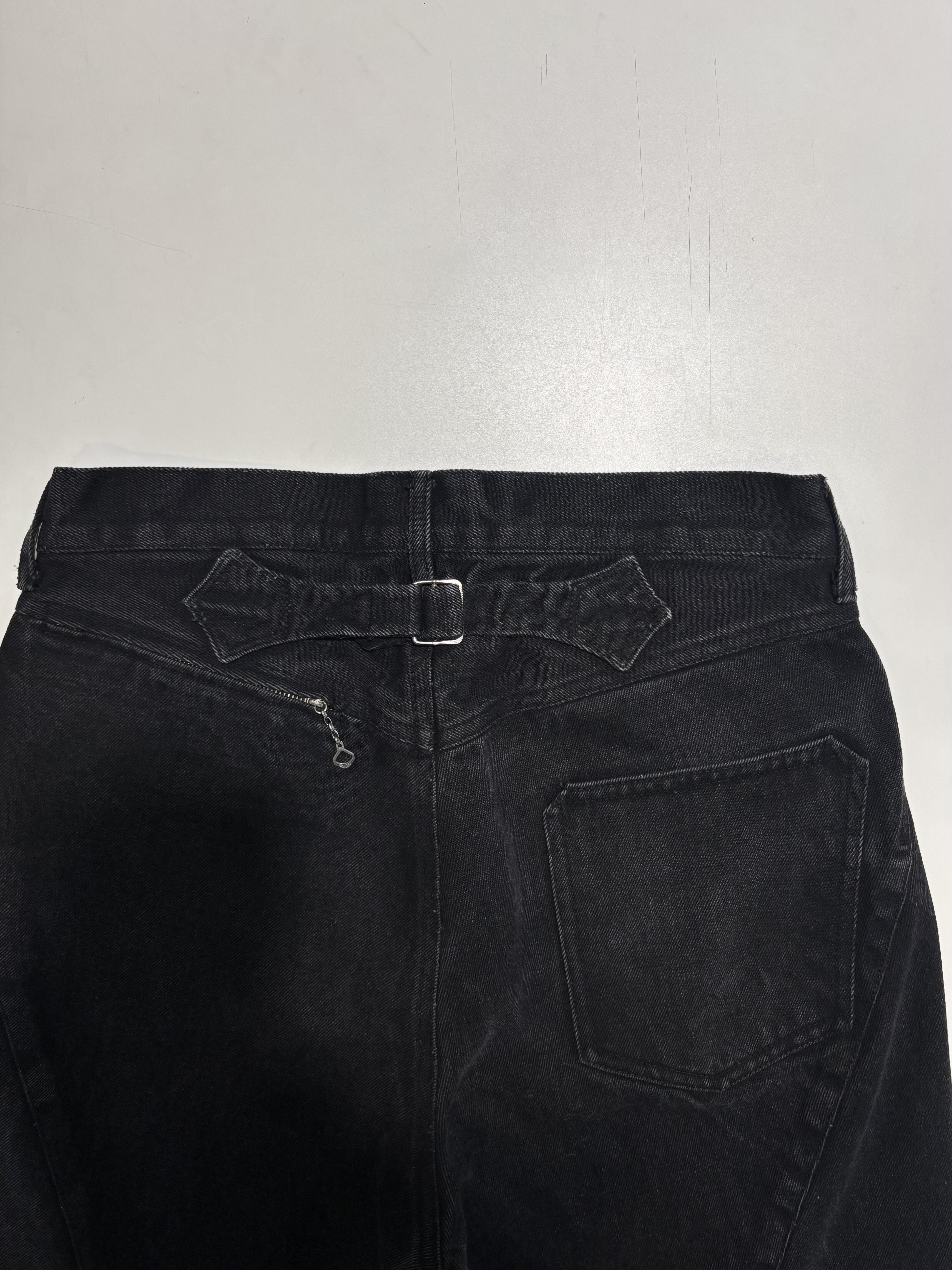 次に背面、サイドから裾に伸びるカッティング、腰部分についたアジャスター、バックポケットジップに使用されている金具はどちらも風合いの感じることのできる金具。