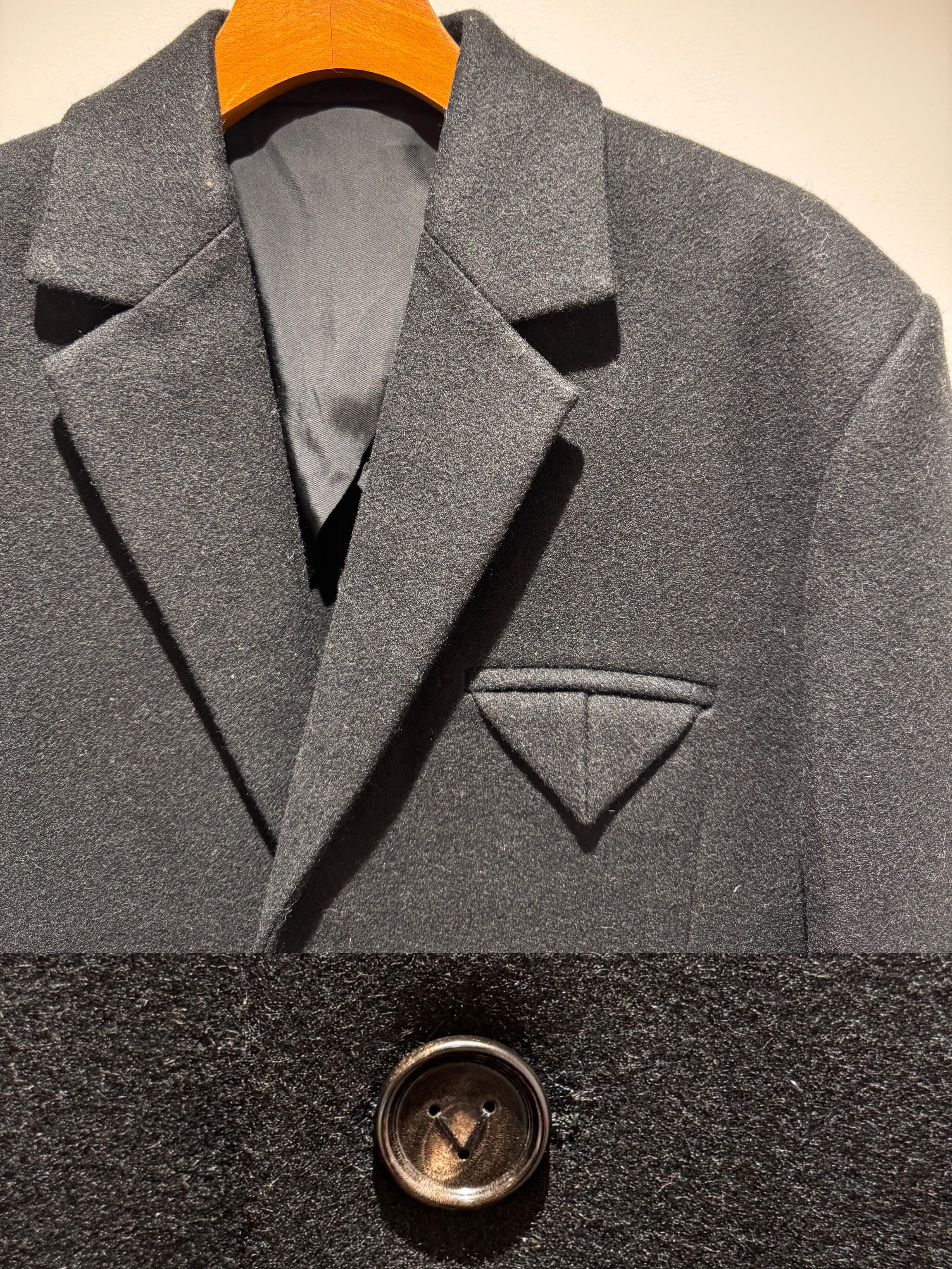 ボタンの縫い仕上がりと胸元には、ボッテガのシグネチャーモチーフであるトライアングルディテールが使われており、クリーンで上品な風合いです。