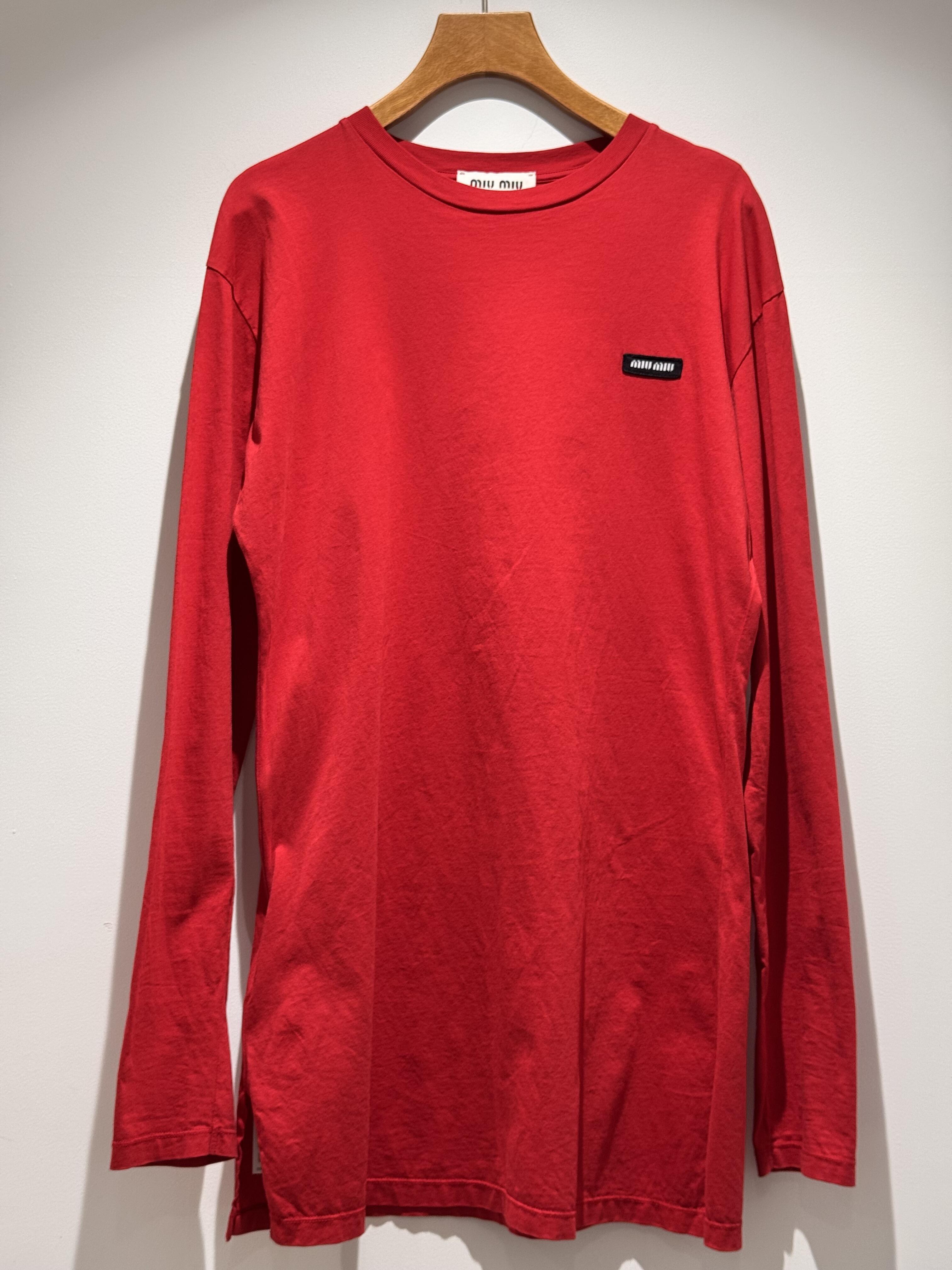 こちらのワンピースとしても着こなせそうなMiu Miuのロングスリーブtシャツは、まさに燃え盛るような赤ですが、主張の強すぎない程よいサイズ感のロゴが胸元にあしらわれており、インパクトも程ほどに抑えられたガーリーな印象です。