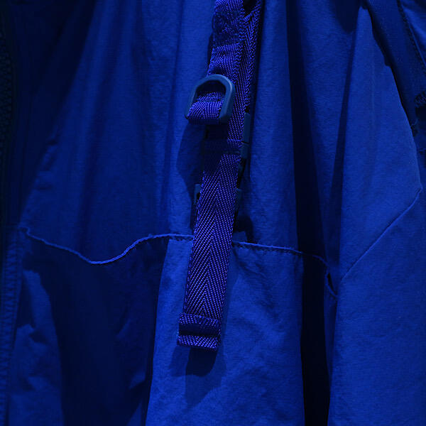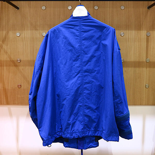ブルゾンの上にベストが重なったようなディテール。青色一色でまとめられているので、ディテールの多い服ながらもまとまりがあると感じられます。