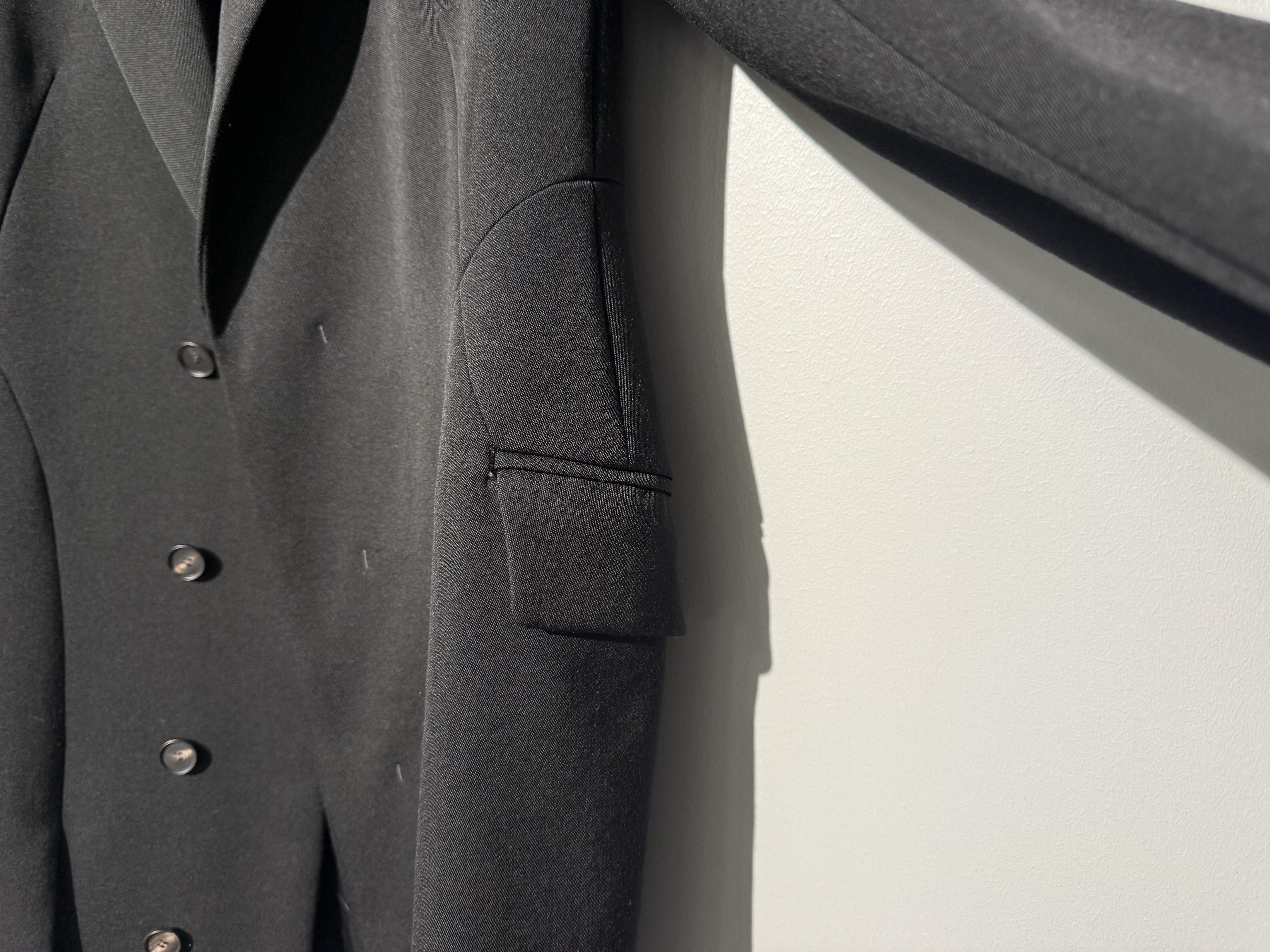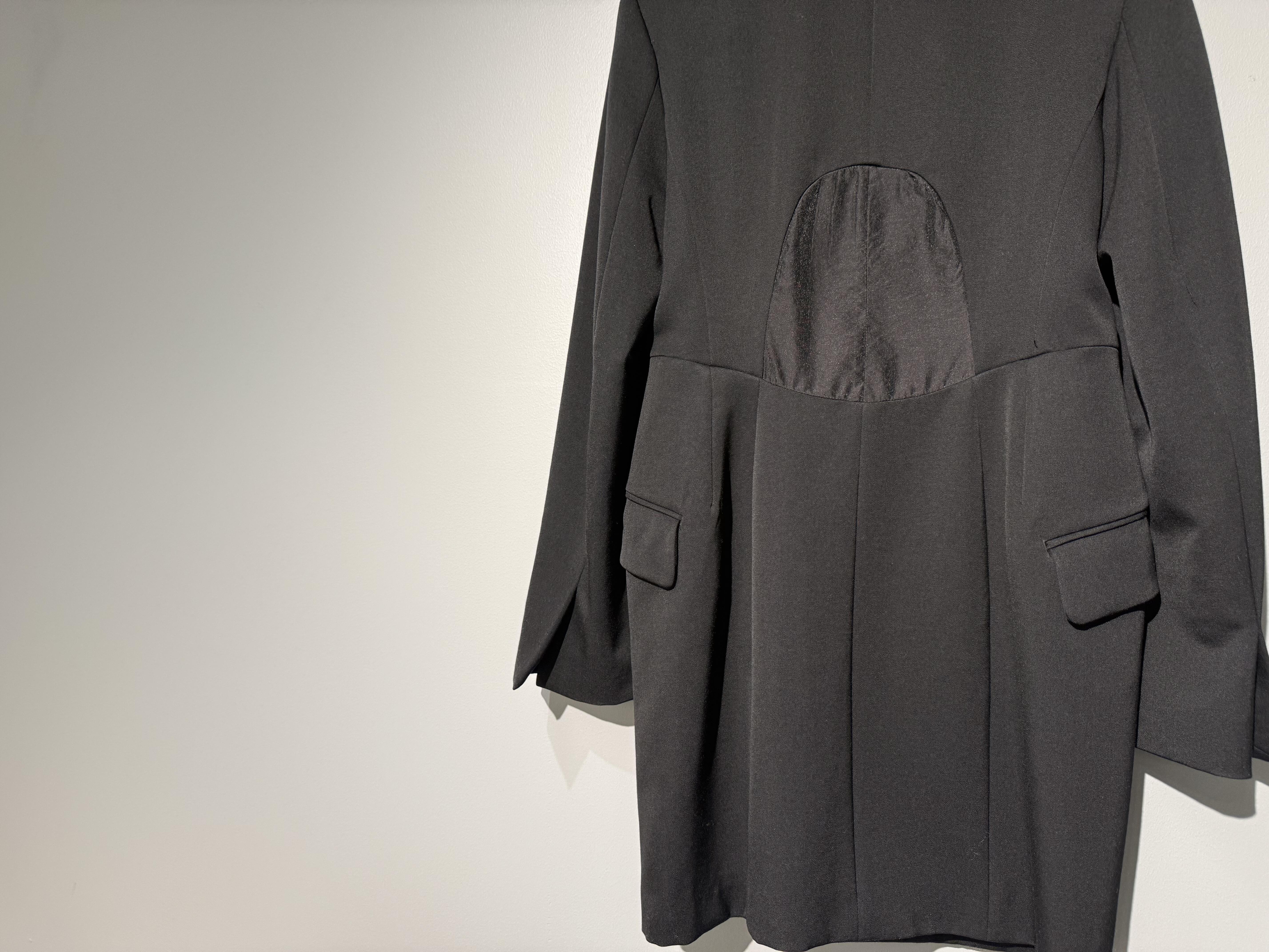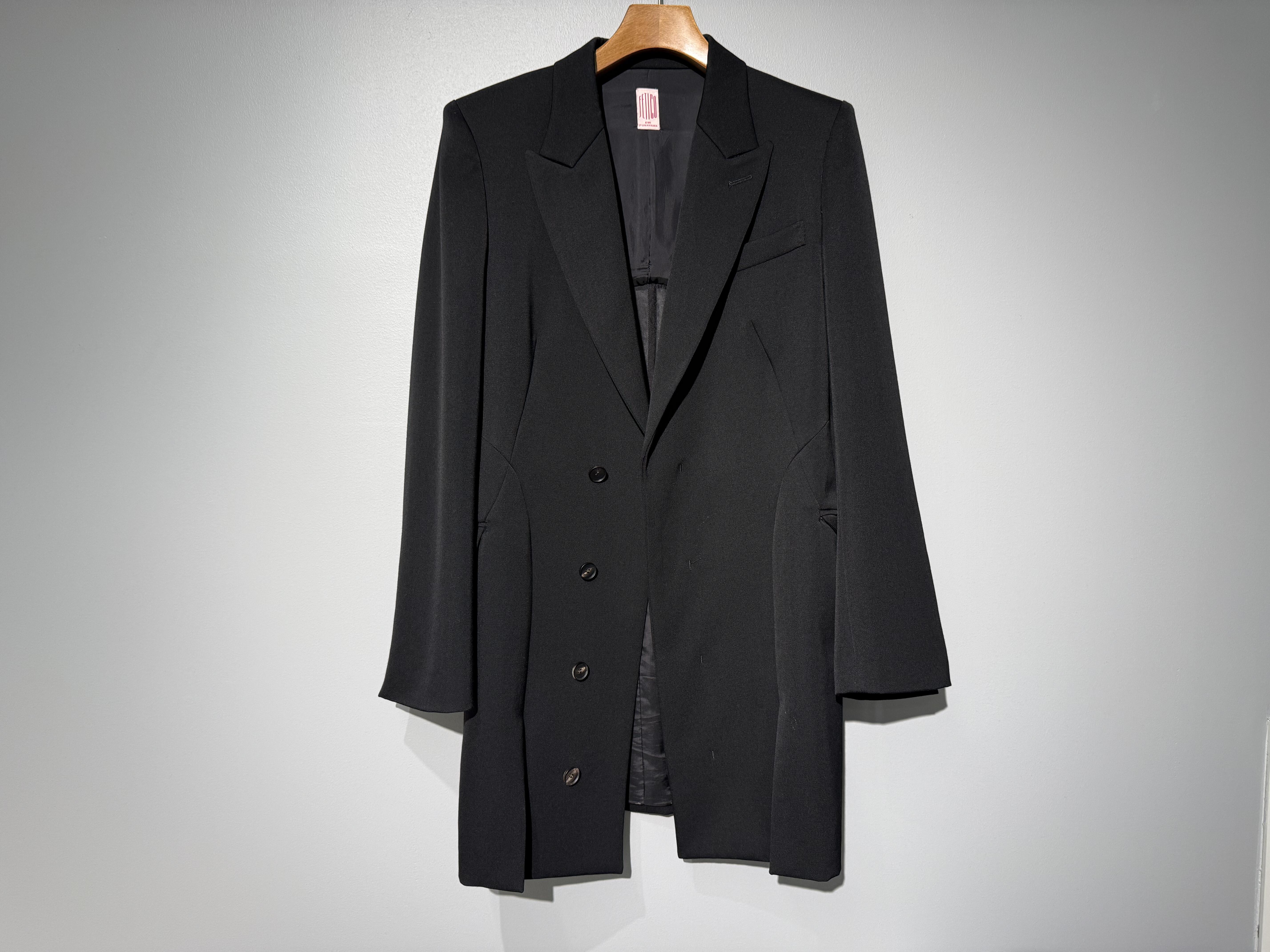 シャープな肩のラインとウエストのくびれが構築的なシルエットのドレスジャケットで、
