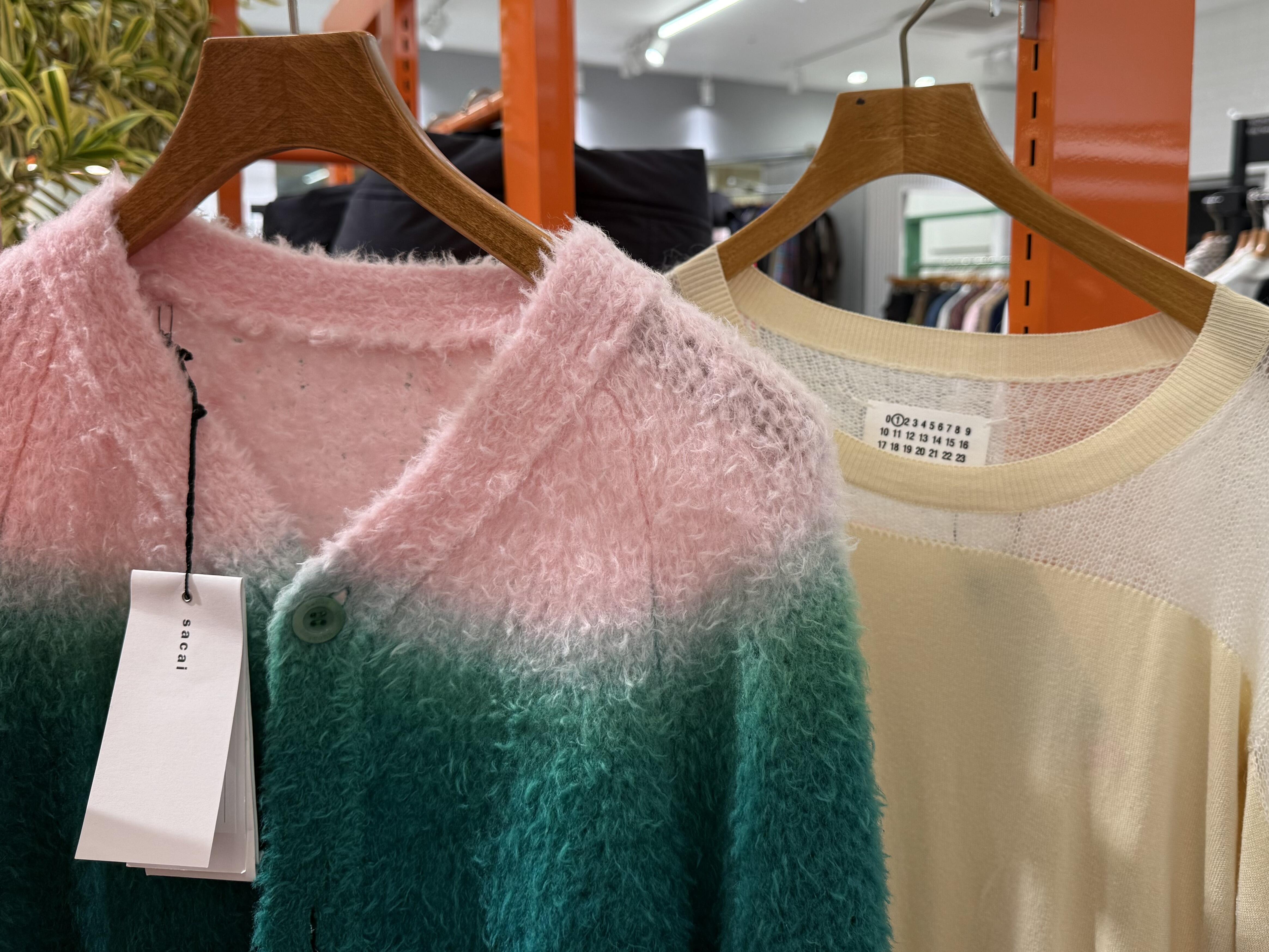 こちらも今すぐ使え一枚でサマになるデザインニット、この機会に手に入れてください。