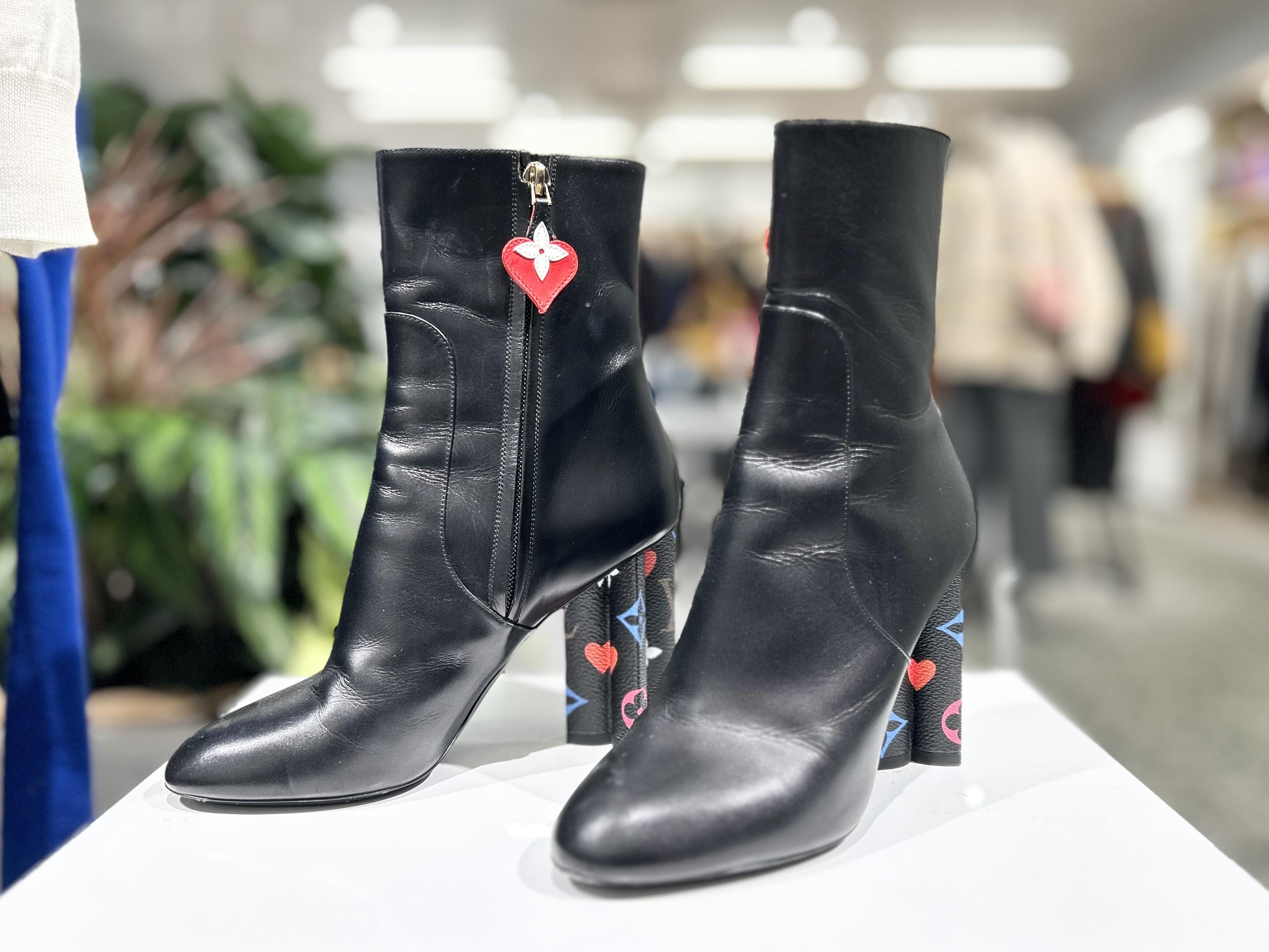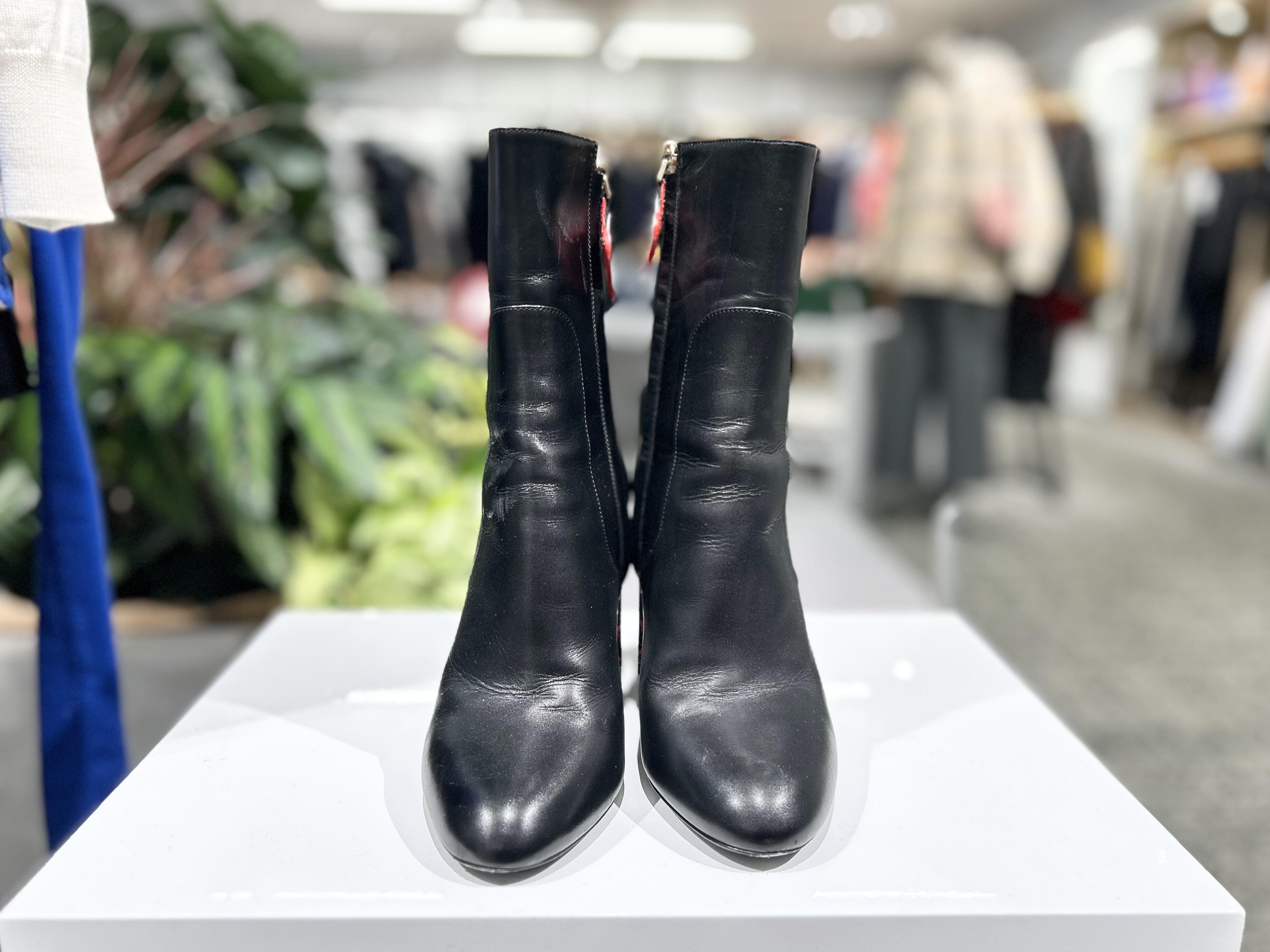 一件シンプルなブーティーですが、サイドジップのモノグラムモチーフがアクセントになったにくい一足。
