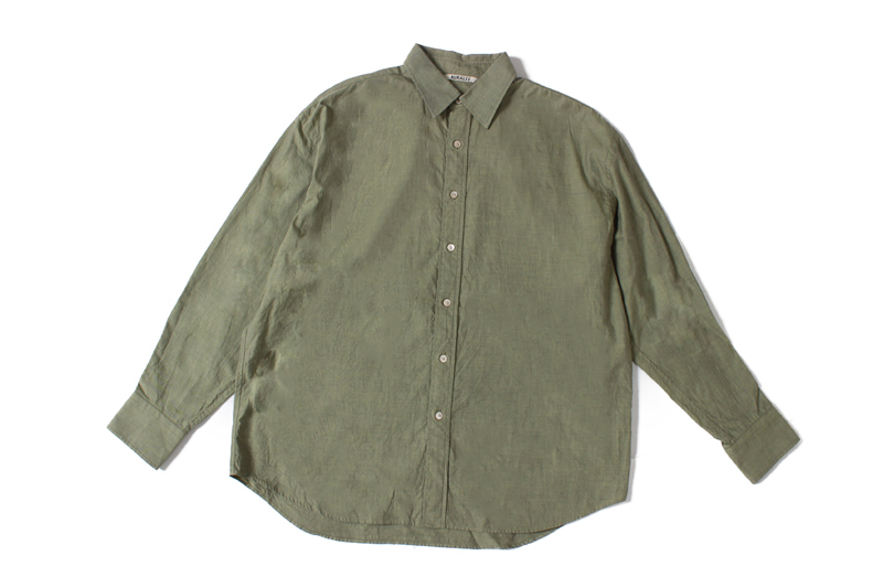 二点目は、[オーラリー]の上品な素材使いが、得に感じられる “ウールリネンツイルシャツ”。細くしなやかな繊維を厳選した「スーパー100’sウール」を使用した、細番手の梳毛(そもう)の杢糸(もくいと)とリネンを使用し、高密度に織り上げたツイル地を採用しています。