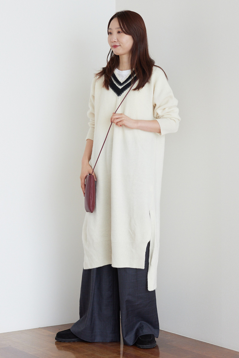 [アダワス]のライン入りニットワンピースはどこかトラッドな印象に仕上げてくれるアイテムです。厳選された上質な素材を使用したアイテムなので長く着ていただけるのがうれしいポイント。今回はワイドなスラックスと、ぽってりとした存在感のある[カミナンド]のローファーを合わせて、ボーイッシュなトラッドスタイルでまとめました。