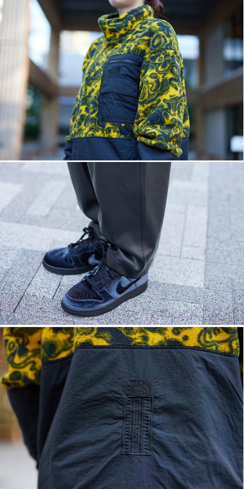 アウトドアブランドの王道、[ノースフェイス]のフリースは、プルオーバーでスウェットのように着用できます。寒い冬は、ややボーイッシュなスタイリングでメンズアイテムをうまく組み合わせてスタイリングをするのもおすすめ。今回はボトムスに[ユナイテッドアローズ]のフェイクレザーパンツ、[ナイキ×ドーバーストリートマーケット]のベロアスニーカーを合わせて少し辛口なスタイリングです。