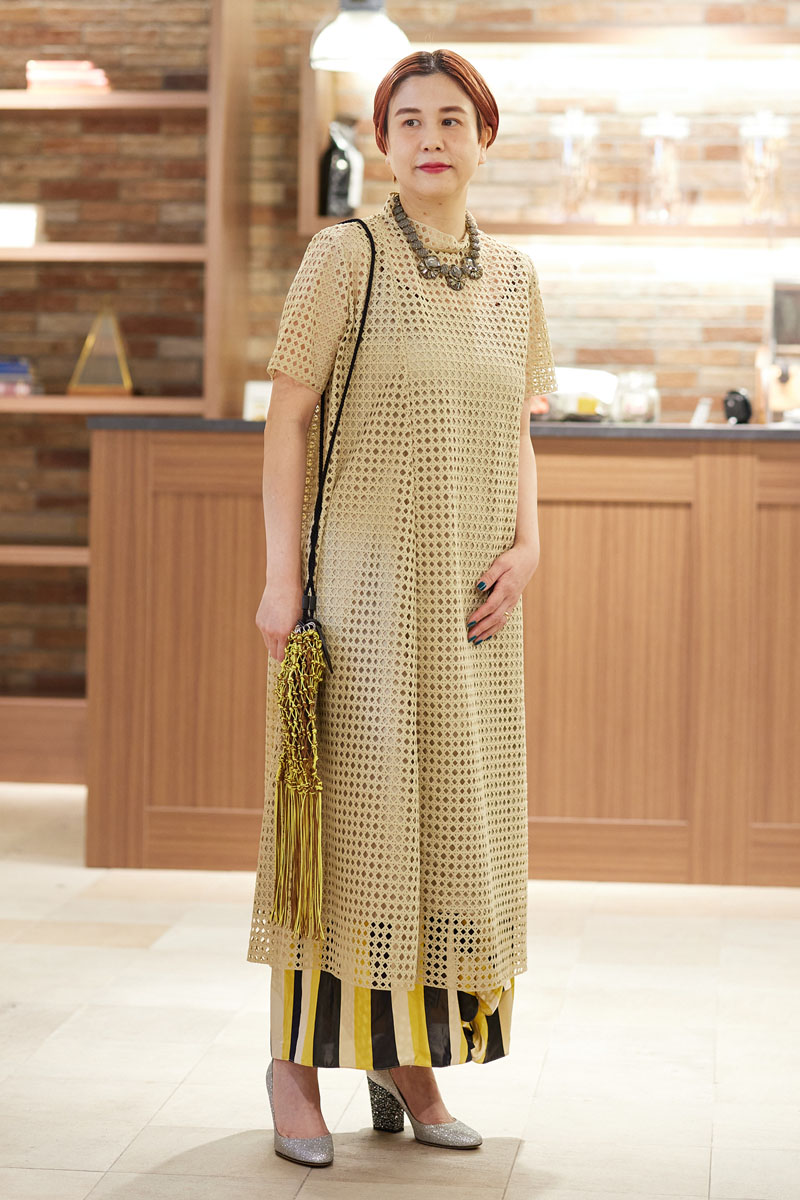 構築的なシルエットが美しい[レキサミ]のワンピースに、裾からチラ見せさせるだけでも存在感のある[ステラマッカートニー]のスカートをレイヤード。クリーンで清潔感のあるベージュカラーがベースとなり、お呼ばれシーンでもキチンと感がでます。[ジルサンダー]のバッグは、[ステラマッカートニー]のスカートと色を合わせることで、派手さを抑えられ、まとまった印象に。