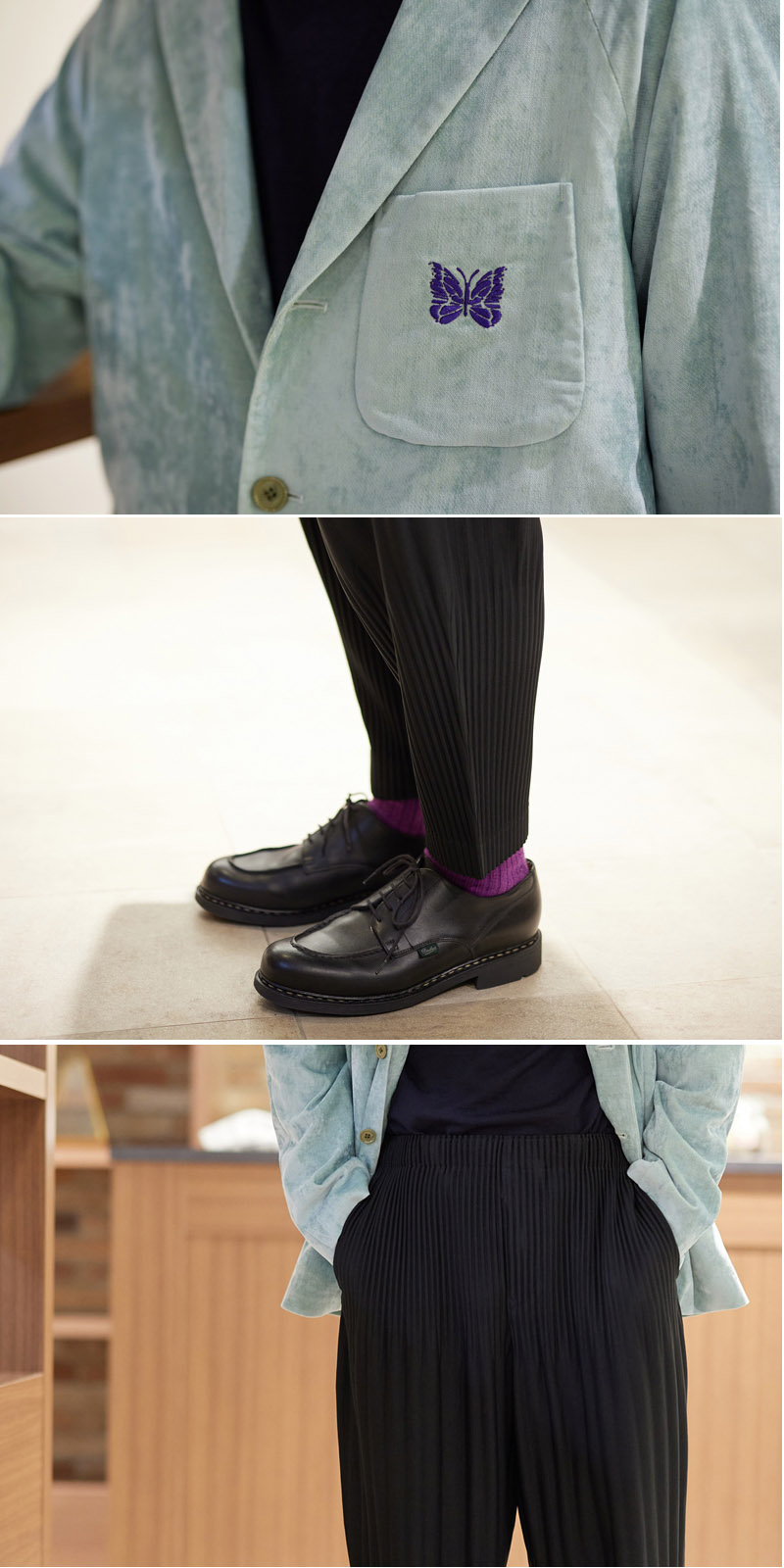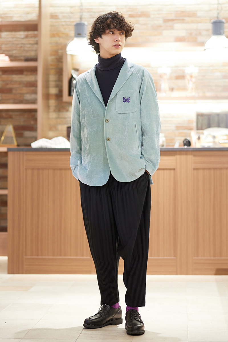 目を惹く鮮やかなカラーリングが印象的な[ニードルズ]のジャケット。落ち着いたトーンのスタイリングが増えがちな今の時期に、ジャケットのスモーキーブルーがアクセントになります。今回は[オムプリッセ]のプリーツパンツと合わせて個性的な組み合わせにしつつ、足元は[パラブーツ]のレザーシューズでカチッときめてバランスをとりました。