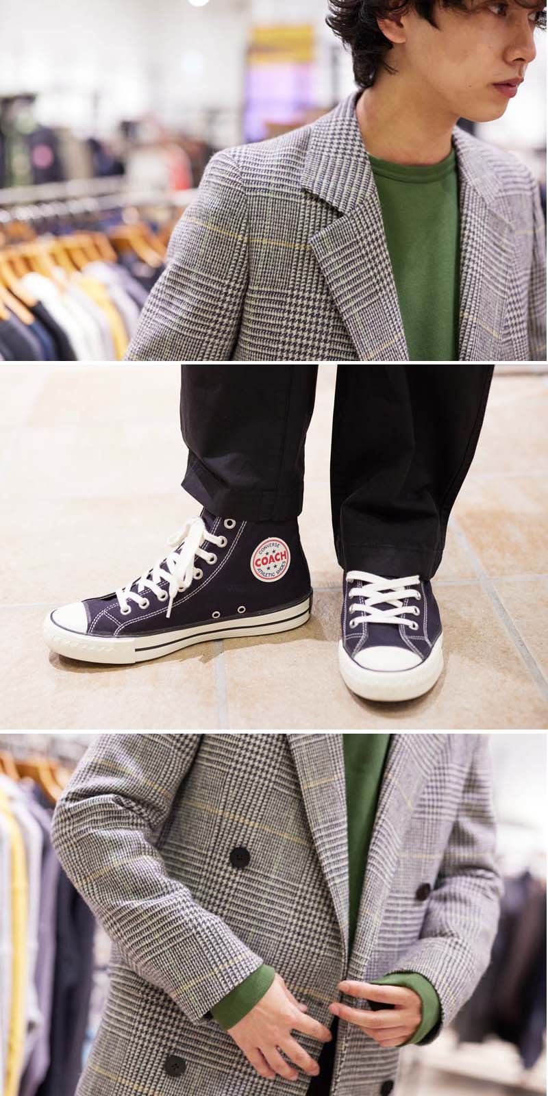 [エディション]のダブルジャケットが主役。少し渋めのトーンなので[ダブルタップス]のグリーンのセーターを差し色に。足元は[コンバースアディクト]のスニーカーを合わせて、全体的にクラシカルになりすぎず、やや抜け感が出るよう意識してスタイリングしました。