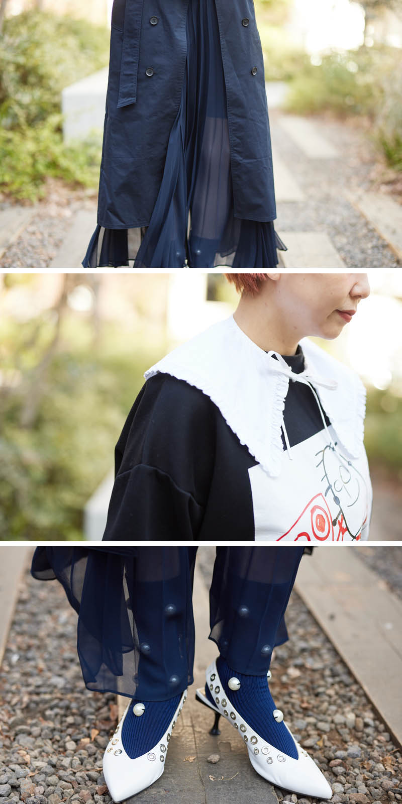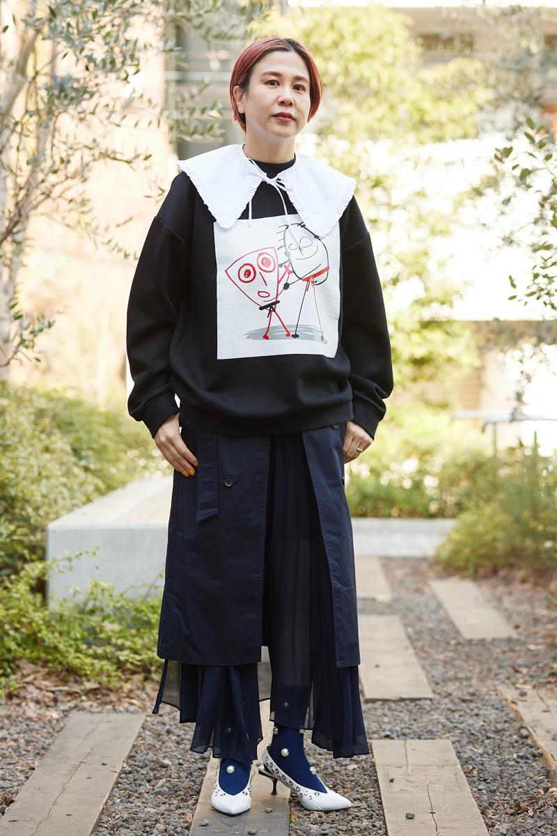 デザイン性の高さを見せつけてくれる[ロク]のスカートは3枚重なったレイヤード風。透け感のあるプリーツ素材は、動くたびにひらひらと角度によって表情を変える、個性的かつ大人っぽさも兼ね備えた一枚です。トップスは[プランシー]のイラストシリーズのスウェットをチョイス。[ガニー]のつけ襟を合わせて、遊び心のある大人可愛いスタイリングで、こなれ感を演出してみました。スタイリングのポイントになる足元は、[セルジオロッシ]のヒールがオススメ。スカートがスタイリッシュなので、甘めのアクセントをプラスしました。