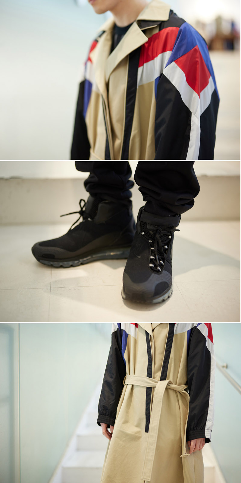 90年代ストリートスタイルのようなナイロンジャケットの袖をドッキングした[コシェ]のトレンチコートがメイン。全体的にモードなスタイリングにまとめました。インナーの素材には、メッシュやジャージなどを合わせて、スポーティーなニュアンスで統一しました。黒とアウターの色味のコントラストが、デザイン性をより際立たせてくれます!