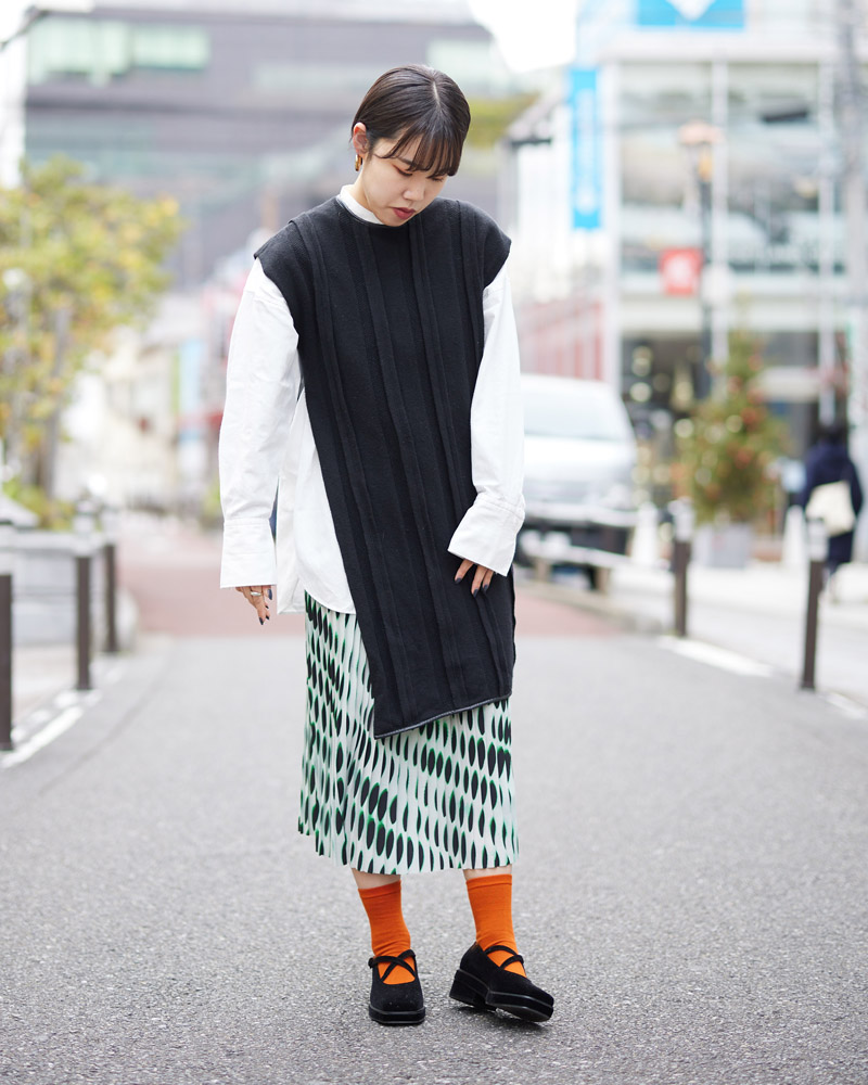 プリーツスカートに、ニットベストの一見、コンサバティブな着こなしも、[エンフォルド]の厚底メリージェーンで大人カジュアルに。ガーリーな印象のメリージェーンも、スクエアトゥ、ミニマルなアッパーなど[エンフォルド]らしい、モードなデティールで、シーンを選ばず合わせやすい一足に仕上がっています。ブラックのシューズは、ソックスのカラーで様々な組み合わせが楽しめます。