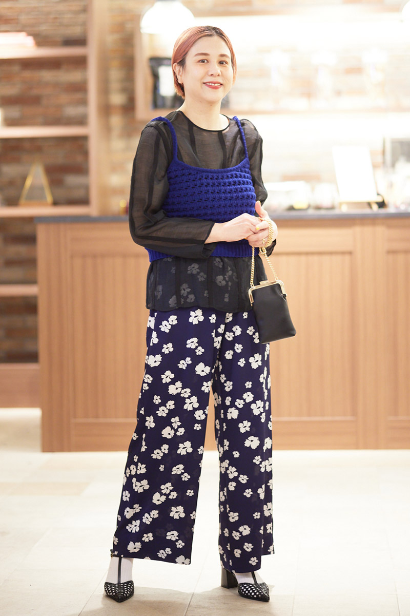 [プラダ]のニットキャミソールをメインに。今回はフェミニンなスタイリングにレイヤードしてみましたが、スニーカーやデニムなど普段のカジュアルなコーディネートに取り入れるだけでも、スタイリッシュで上品な印象に仕上げてくれる逸品です。透け感のある[アキラナカ]のブラウス×花柄ボトムスのロマンティックなコーディネートのアクセントになる一枚です。夏はTシャツに重ねても◎。ロングシーズンで着回し可能な優秀アイテム。