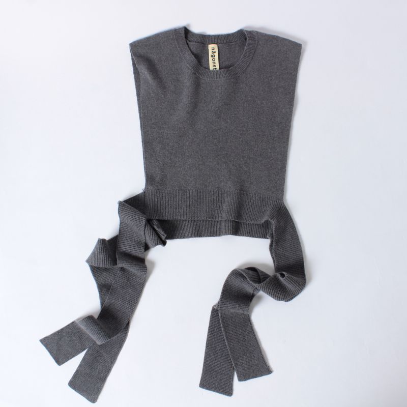 [タン]のニットベストは、後ろが長くマントのようなデザインが特徴的。美しい細かな網目模様が繊細な印象を与えて、華奢な雰囲気に見せてくれます。体のラインが出るシンプルなスタイリングは寂しい印象にもなりがちですが、一点レイヤードするだけでパッと華やかな雰囲気になります。小物はベージュの[オソイ]の3連バックで、全体の色のトーンをまとめています。