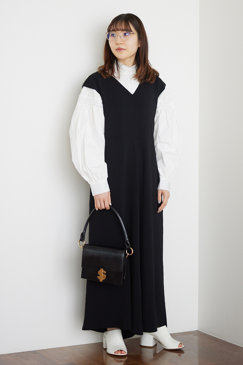 春先のレイヤードスタイルに大活躍な[カオス]のノースリーブワンピース。深めのVネックと、ストンと落ちるIラインシルエットでコーディネートを大人っぽくまとめてくれます。レイヤードするアイテム次第で雰囲気を変えてくれるのも魅力です。今回は[トゥデイフル]のブラウスと[サカイ]のハンドバッグ、[エムエムシックス]のサンダルを合わせて、大人なモノトーンスタイルに仕上げました。