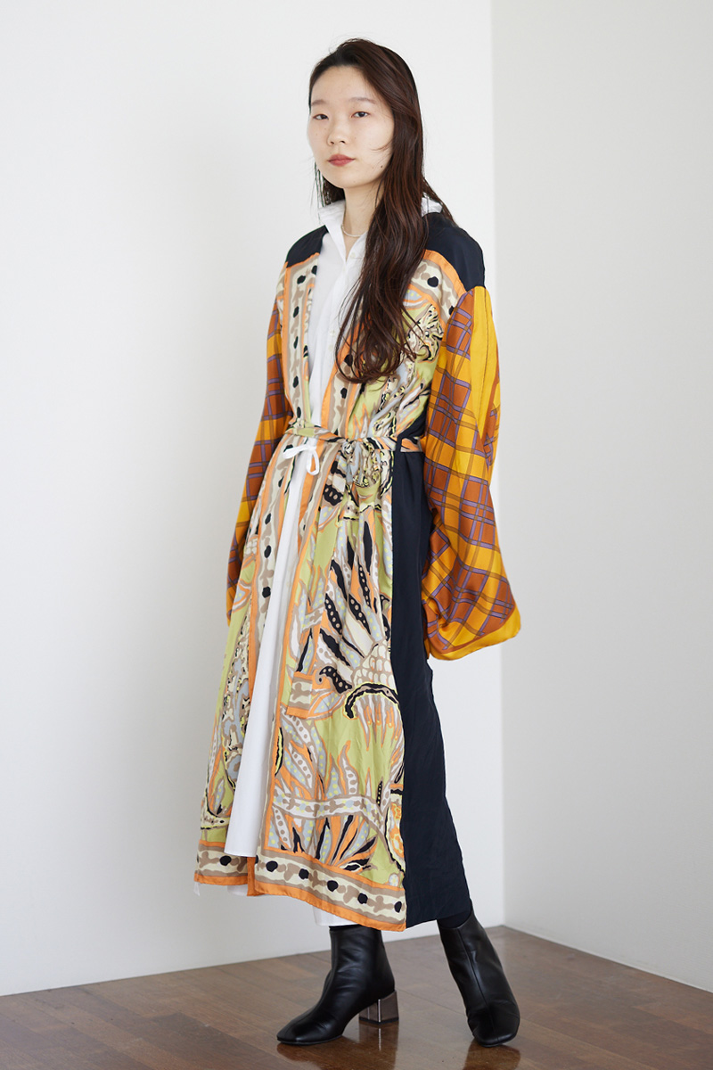 インパクト大の目を引く派手柄は、さすが[ドリスヴァンノッテン]。テロっとしたとろみのある生地を活かし、羽織として取り入れることでモードな雰囲気のコーディネートにしてみました。レイヤード次第でモードにもカジュアルにも着回せるのが嬉しいポイントです。主役のワンピースを引き立てる為に、インナーにはあえてクリーンな印象の[リト]のワンピースをチョイスし、全体のバランスを取ってみました。