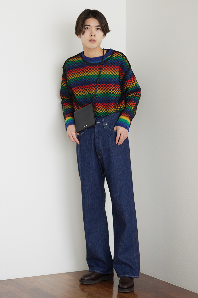 [オーラリー]のデニムパンツを中心にコーディネート。こちらのデニムは、色の風合いや生地感、シルエット全てにこだわりの詰まったブランドらしい一本。無駄な装飾が一切ないので、クリーンな印象にまとめてくれます。トップスは[アクネステュディオズ]のレインボーカラーのニット。品のあるデニムだからこそ、エネルギッシュで遊び心のあるトップスを合わせても程よく中和してくれます。メッシュのトップスを上にレイヤードして、子どもっぽくならないように意識しました。