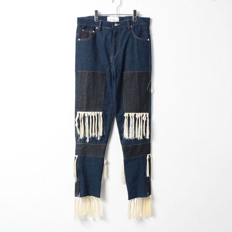 [セブンバイセブン]を象徴する再構築デザインのアイテムです。前後で絶妙に違う生地の色や、通常より下に位置するポケット、ワイドな造りの裾など計算された豊富なディティールが多く盛り込まれています。ダメージ感ある生地を使用していますが、細身で現代的なシルエットなので、野暮ったくならず履いていただきやすいアイテムだと思います。
