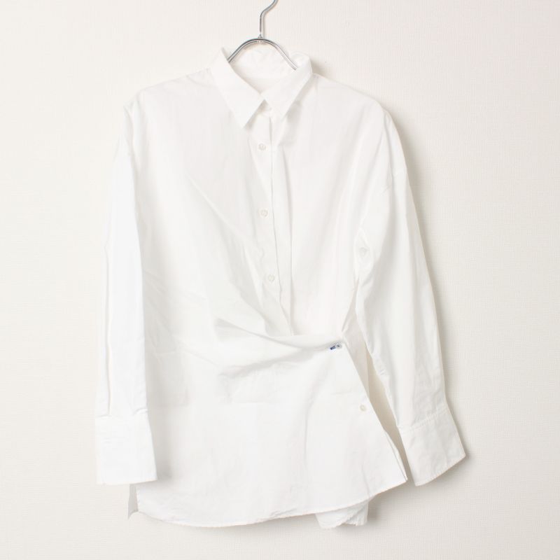 洗練されたシンプルさがありながら、細かいディテールがポイントの[アニティア]のシャツをメインにスタイリング。一見シンプルに見えますが、フロントデザインや袖のドローコードなど、存在感のあるデザインが魅力です。ボトムは[マヌーシュ]のインパクトのある柄スカート。ベースは定番の白シャツなので、着回し力抜群なのも嬉しいポイントです。定番アイテムは欲しいけど、人と被りたくない!という方におすすめです。