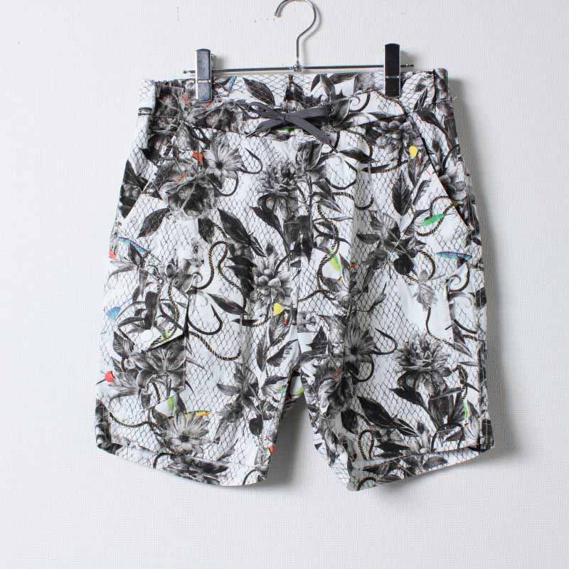 [コムデギャルソンオムプリュス]のショーツをメインにスタイリング。コーディネートの主役になる花柄のプリントが高貴な雰囲気を醸し出します。トップスには、肩から袖にかけて破れたようなデザインが特徴的な[コムデギャルソンオムプリュス]のシャツと合わせて、ブランドらしさを感じるスタイリングに。品よく派手にインパクトのある装いに仕上げました。