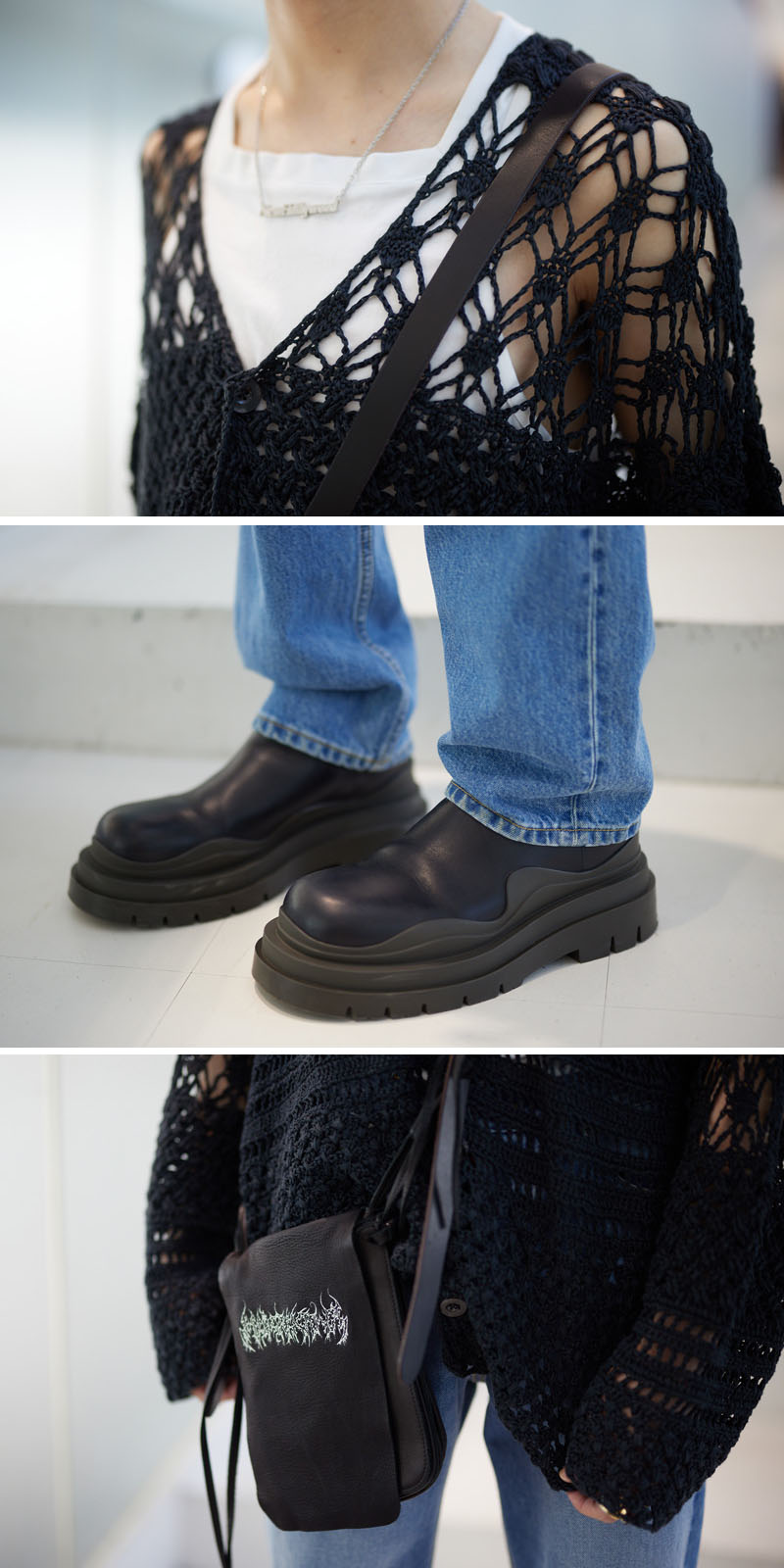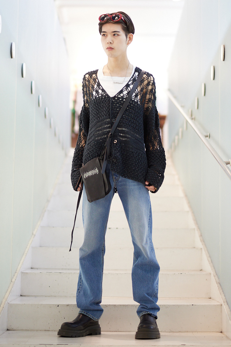 フェアアイル柄のようなデザインや編み目の粗さが特徴的な[シンヤコズカ]のクロシェットニットカーディガンを主役にコーディネート。編み目の粗いニットは、インナーにタンクトップを合わせて程よく肌を見せることで、ジェンダーレスな魅力のスタイリングになります。デニムパンツやサングラスと合わせて、グランジ感を出したのもポイントです。