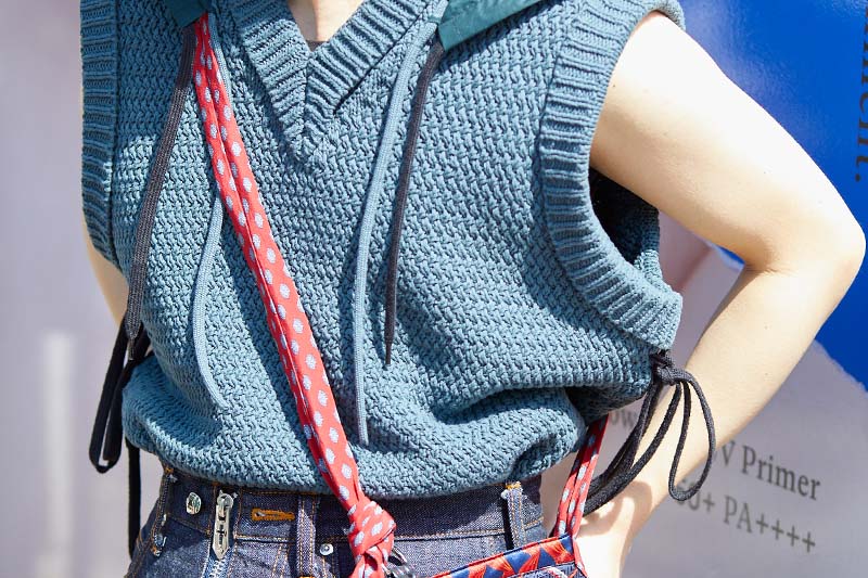 「デザイン性の高いニットベストはタイトな作りなので、トレンド感のあるバギーパンツでAラインを作り、今っぽいスタイリングに。小物は赤で揃え、アクセントにしました」