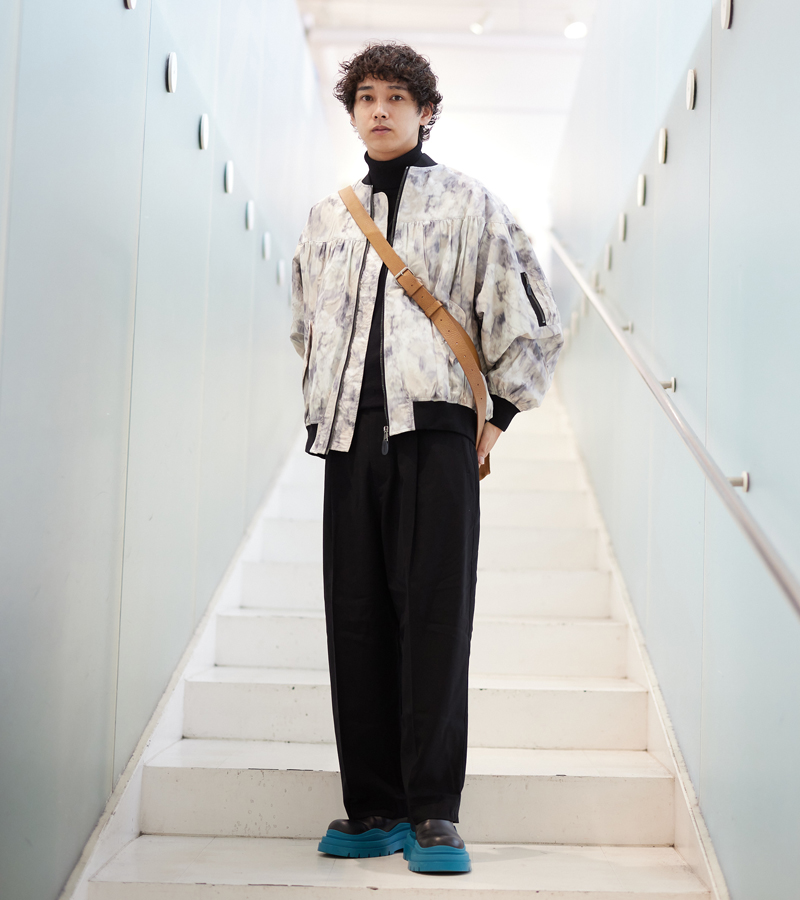 [ラフシモンズ]のボンバージャケットをメインにコーディネート。インパクトの強いアウターに、[ストーンアイランド]のタートルセーターと[ロエベ]のワイドパンツで、シンプルかつ上品にまとめました。単体で見るとモード感の強いアイテムも、合わせ方次第で街に馴染むスタイリングになります。足元は[ボッテガヴェネタ]のブーツで、アクセントも忘れず。