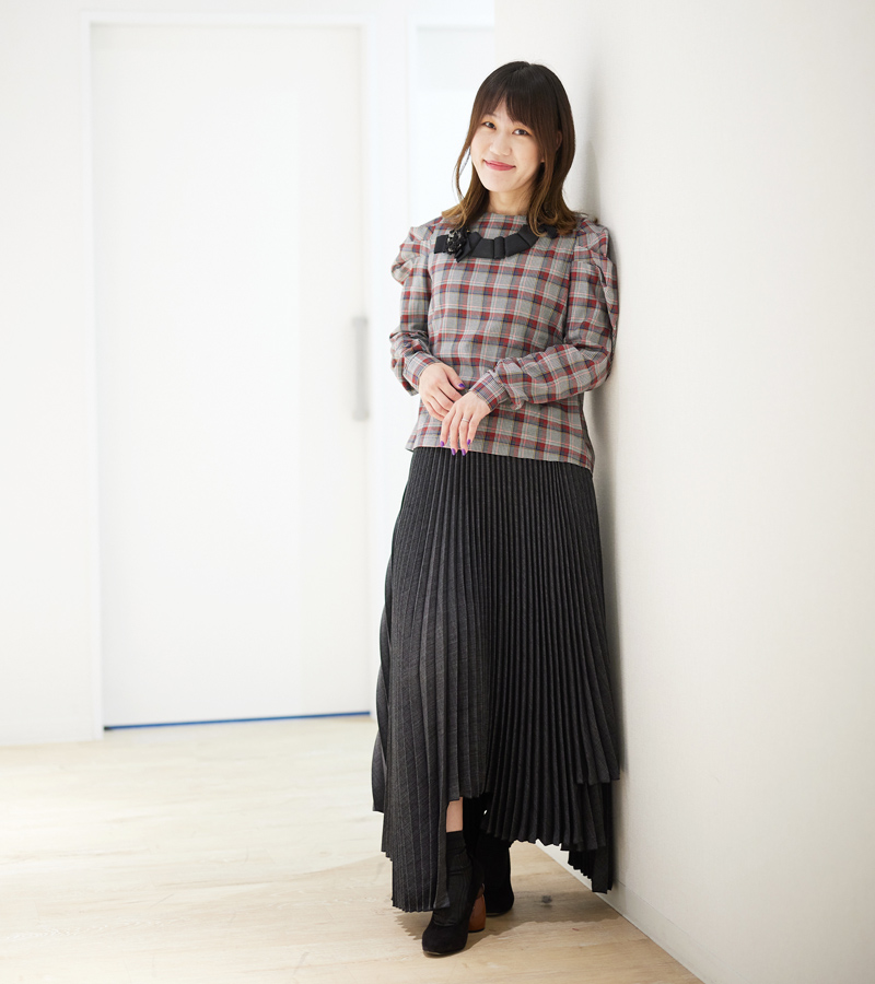秋と言えば定番のチェック柄アイテムが着たくなりますが、自分らしいシルエットやデザインにはこだわりたいところ。[メゾンキツネ]のトップスは、ボリューム感のあるショルダーが印象的でレディな雰囲気を纏えます。今年は大人っぽい、やや細かめのチェック柄が気になります。シックな雰囲気のグレーのプリーツスカートを合わせ、まとまりのある上品なスタイリングを意識しました。(Staff:Mitani 160cm)