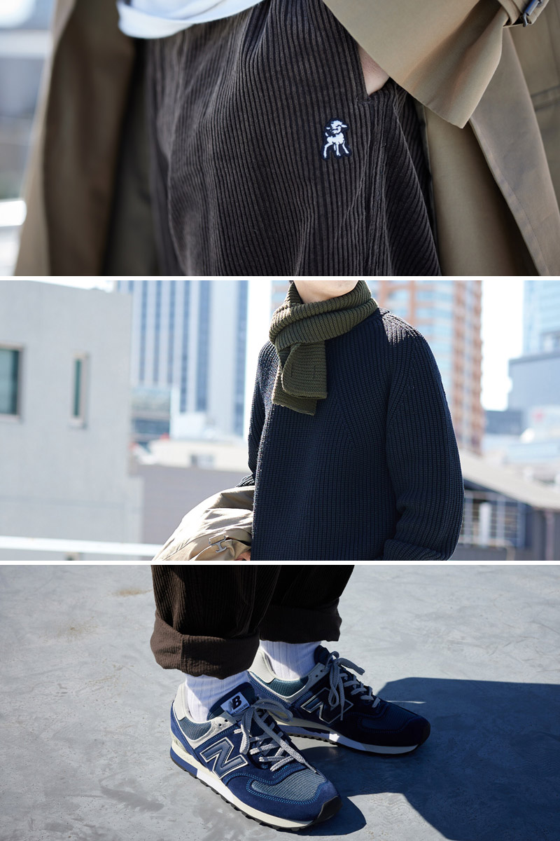 [ザ シェパード]のパンツはウエストゴムとパッカリングのリラックスした作りが特徴的。コーデュロイは保温性に優れた秋冬の代表的な素材。厚手の生地のものが多く、冬のニットやアウターにも負けない存在感です。ハンティングウェアとしても採用されてた生地ですが、コートのベージュと合わせてトーンオントーンを作れば、きれいめな印象にも仕上がります。