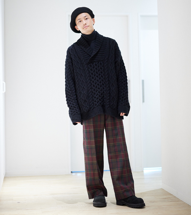 [ドリスヴァンノッテン]のスラックスは太めのストレートシルエット。柄物のボトムスは他のアイテムの色味をまとめると、取り入れやすくなります。さらに今回は、チェック柄のクラシカルなニュアンスを、ケーブル編みとショールカラーで拾ってみました。また、足元にボリュームのあるブーツを合わせて、重心を下に持ってくると、ぐっとモードな印象が強くなります!