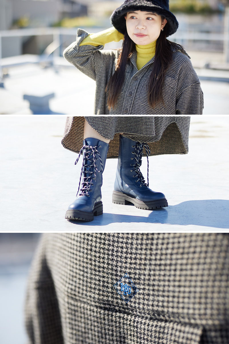 [ブルーバードブルバード]のカシミヤ素材のシャツワンピースは、上品な質感でサラッと一枚でもお出かけできるデザイン。暖かさや着心地も抜群なので、羽織りとしても使える優秀アイテムです。そんなシャツワンピースでレイヤードを楽しむなら、色物を組み合わせて自分らしくアレンジするのがおすすめ。薄手インナーで目を引くライトグリーンを取り入れて、垢抜けた印象に仕上げました。シューズやハットなどの小物はブラックで引き締めるのが、カラーコーデのポイントです!