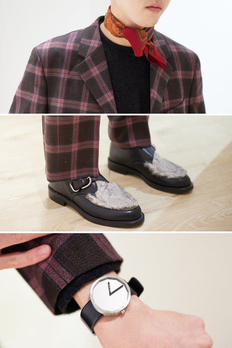 主役級の[ポールスミス]のセットアップ。遊び心のあるチェック柄デザインですが、色味のトーンが落ち着いているので、ちょっとしたお食事会やお出かけなど幅広いシーンで着用できます。今回はより大人っぽく着こなすために、インナーやシューズはブラックやグレーで揃えました。柄物の着こなしが難しいと感じる方は、あえてさらに目立つ色柄のスカーフを投入してみるのがおすすめです。「目立つ色を合わせたら、もっと派手になってしまうんじゃ…?」と心配されるかもしれませんが、スーツの他のアイテムで小さなポイントを作ることで、目線を分散させてバランスを取ることができます。